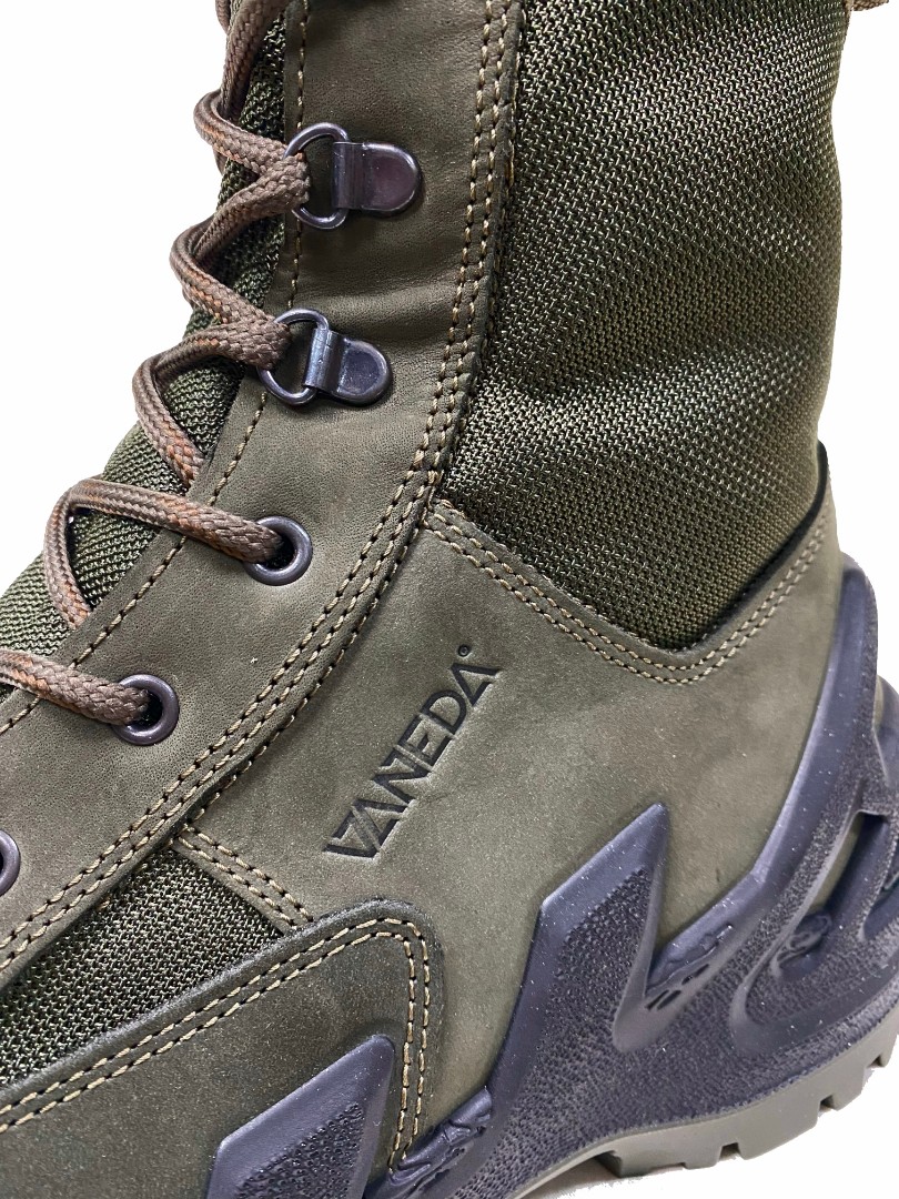 Ботинки Vaneda – это комфортная летняя обувь. Благодаря комбинированному верху из прочной нубуковой кожи и качественной шнуровке на петлях, эти ботинки обеспечивают надежное крепление на ноге и имеют жесткий носок. Они также обладают внутренней дышащей подкладкой из полиэстера. Ботинки Vaneda также оснащены стелькой Poliyou, которая обеспечивает циркуляцию воздуха и имеет антибактериальное покрытие. Усиленный подносок дополнительно защищает ноги от травм, что весьма важно для военных. Подошва особой плотности обеспечивает легкость и высокий амортизационный комфорт. Полиуретановая подошва равномерно распределяет вес благодаря высокой конструкции боковин. Таким образом, она лучше защищает стопу при длительных походах и скалолазании. Конструкция подошвы обеспечивает эффективную защиту передней части стопы и пятки от внешних воздействий. Нижняя часть подошвы: Благодаря резиновой подошве NUBES I-RUBBER она обеспечивает высочайшее сцепление с поверхностью. Специальный рисунок подошвы обеспечивает максимальную производительность в условиях бездорожья.