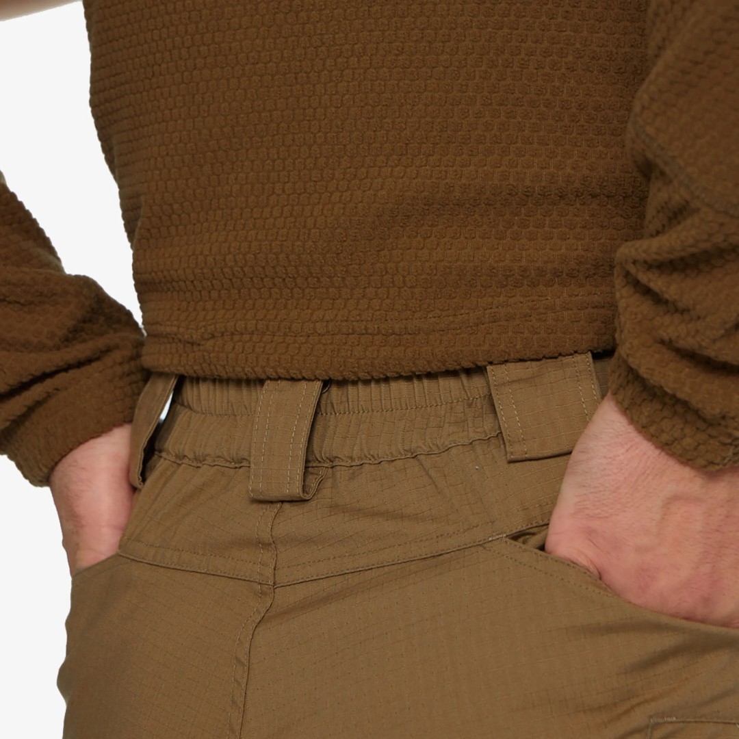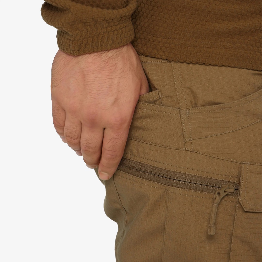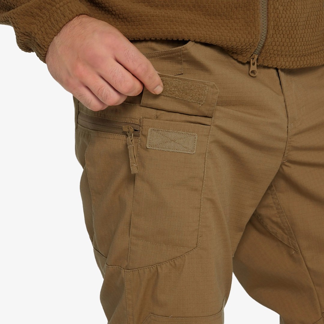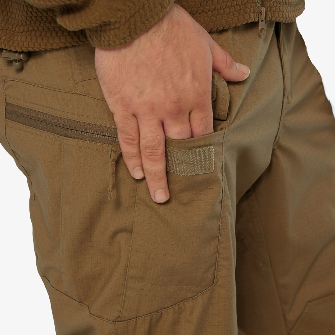 Расположение карманов позволяет распределить нагрузку вблизи центра тяжести и вокруг бедер и талии. Края карманов усилены, чтобы выдерживать постоянное скольжение зажимов для фонарей и ножей.