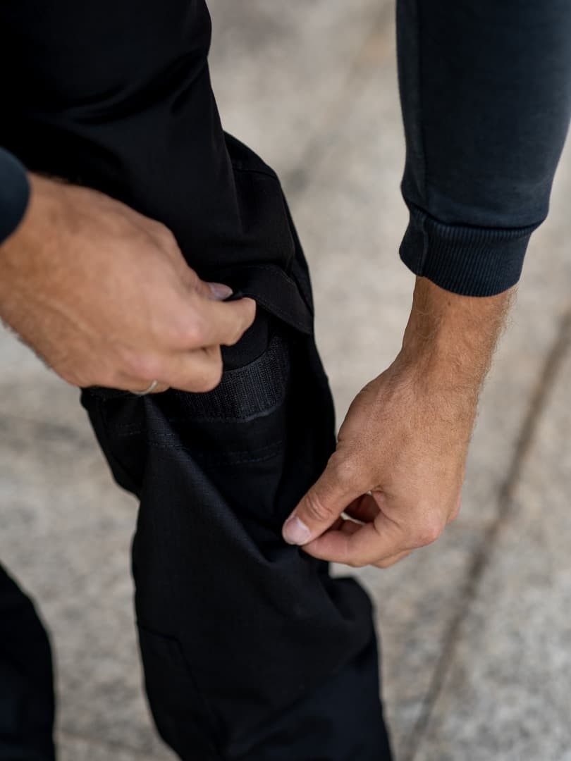 Материал плотный, Rip-Stop реально ощущается — не боишься зацепиться или где-то потереть. Колени усилены, плюс есть возможность вставить защиту — для активного использования это большой плюс.