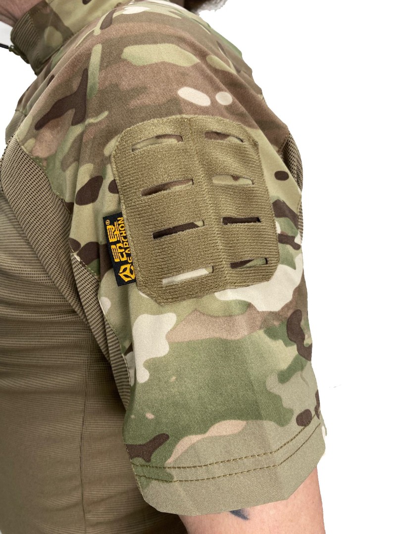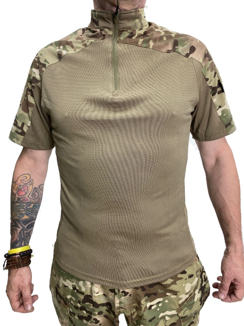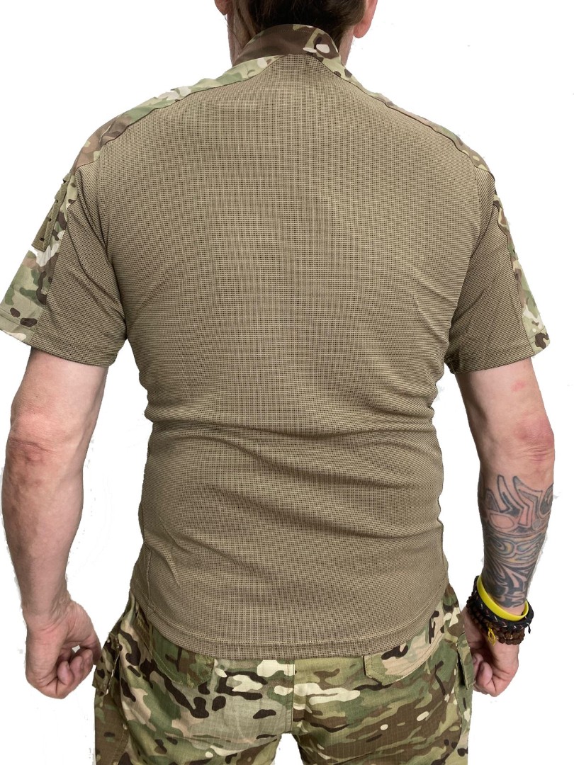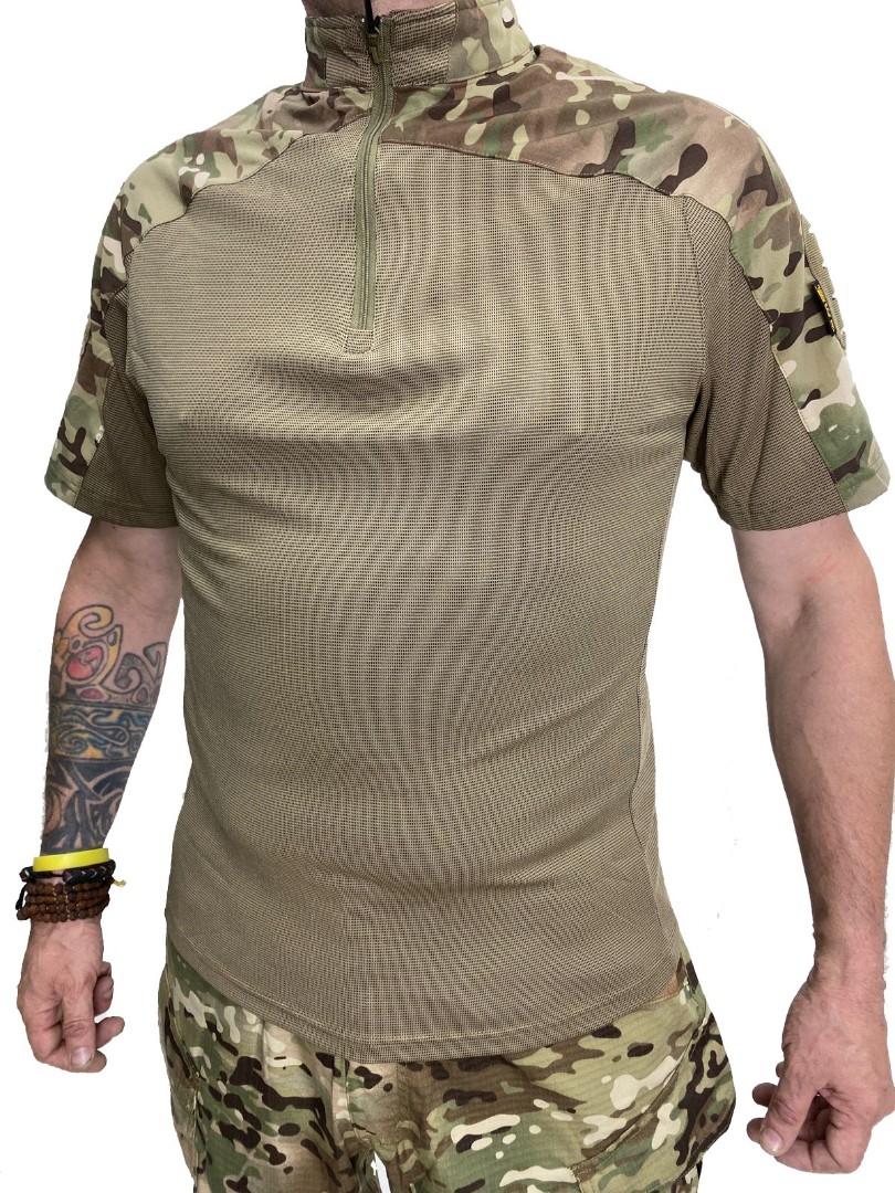 Тактическая футболка из синтетической и дышащей ткани Coolmax. Верхняя часть выполнена из нейлона, основная часть футболки состоит из полиэстера и спандекса. На рукавах расположены панели велкро для крепления знаков отличия. Футболка обладает хорошей эластичностью за счёт спандекса.
