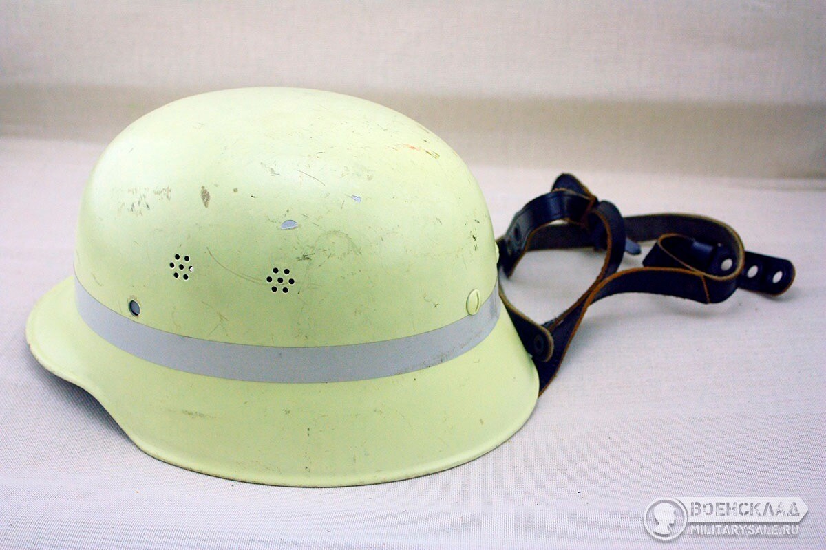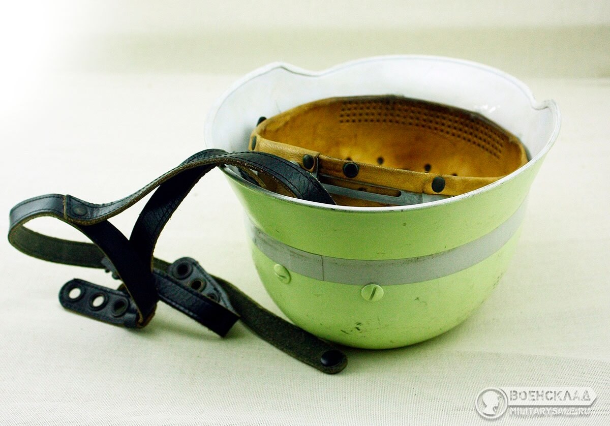 Лёгкая алюминиевая каска с кожаным подшлемником и подбородочным ремнем .