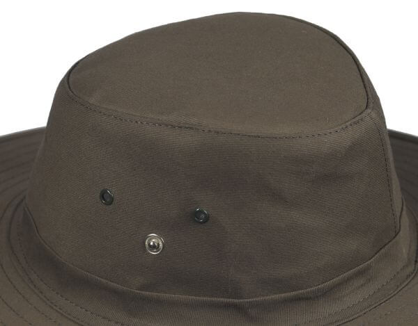 Бушхет имеет плотную тулью, оборудованную кнопками и люверсами. Поля могут пристегиваться к тулье на кнопку