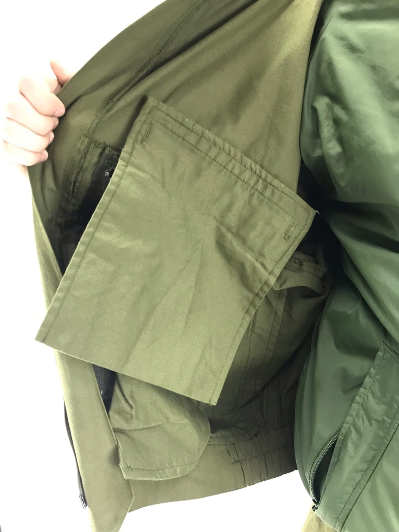 На куртке четыре кармана,2 нагрудных на молнии,2 кармана по бокам.Воротник лежачий,при необходимости может делать в стойку,при помощи крепления велкро.Утяжка-резинка сзади,в районе спины и в нижней части куртки.Рукав утянут вшитой резинкой регулируется с помощью липучки велкро,имеется молния для удобного снятия.
