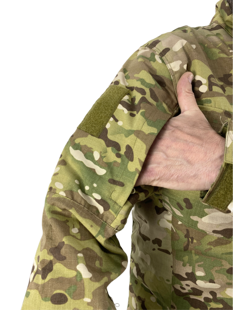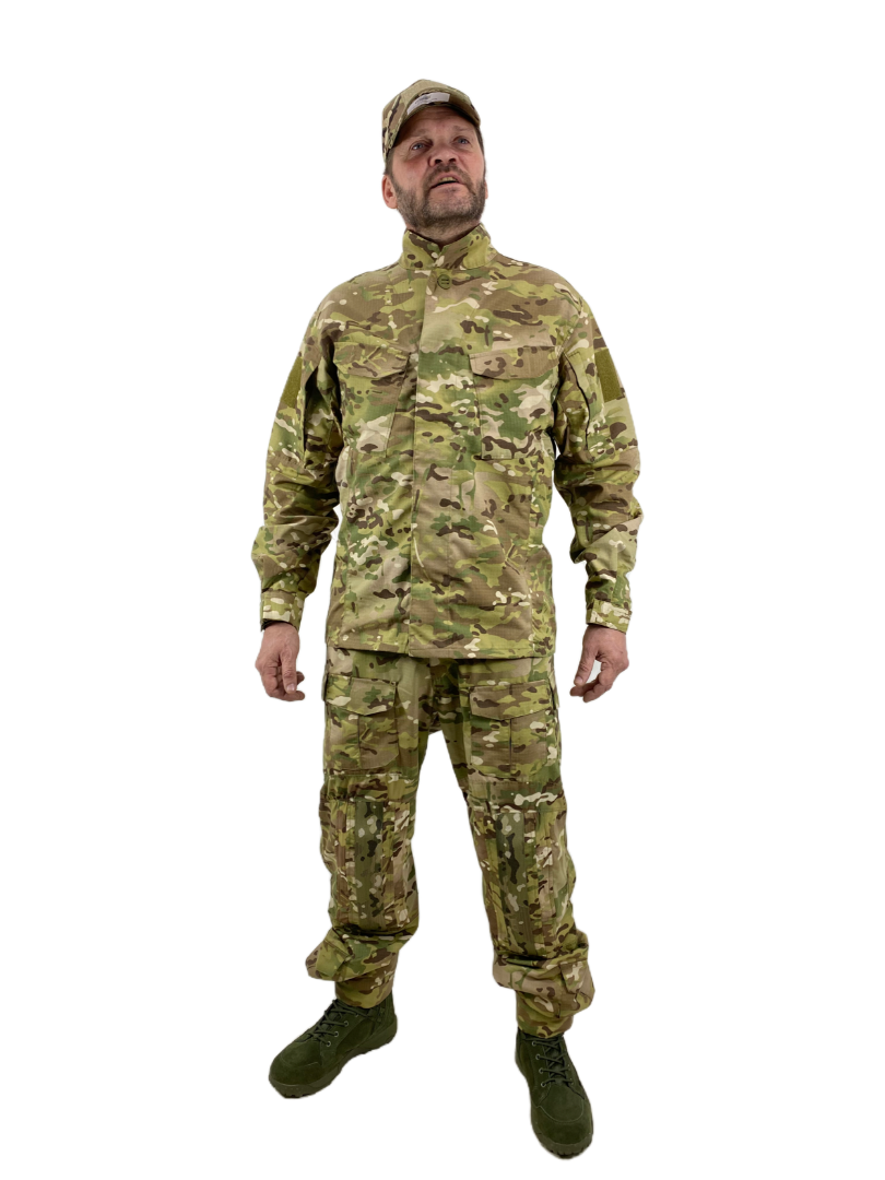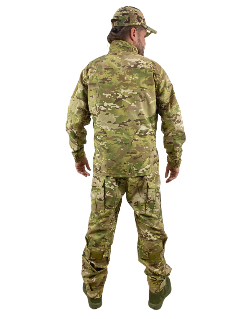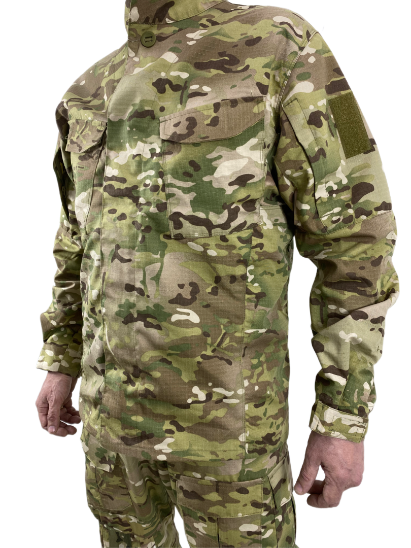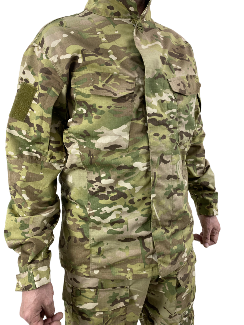 Тактический боевой костюм в мультикаме, в комплект входит рубашка и брюки. Рубашка выполнена из ткани Rip-Stop, воротник-стойка при необходимости складывается, на рукавах расположены панели велкро для крепления патчей или знаков отличия и скрытые карманы в верхней части. На груди расположены два кармана на липучке велкро. Рубашка закрывается на молнию и защищена дополнительной тканью от повреждений.