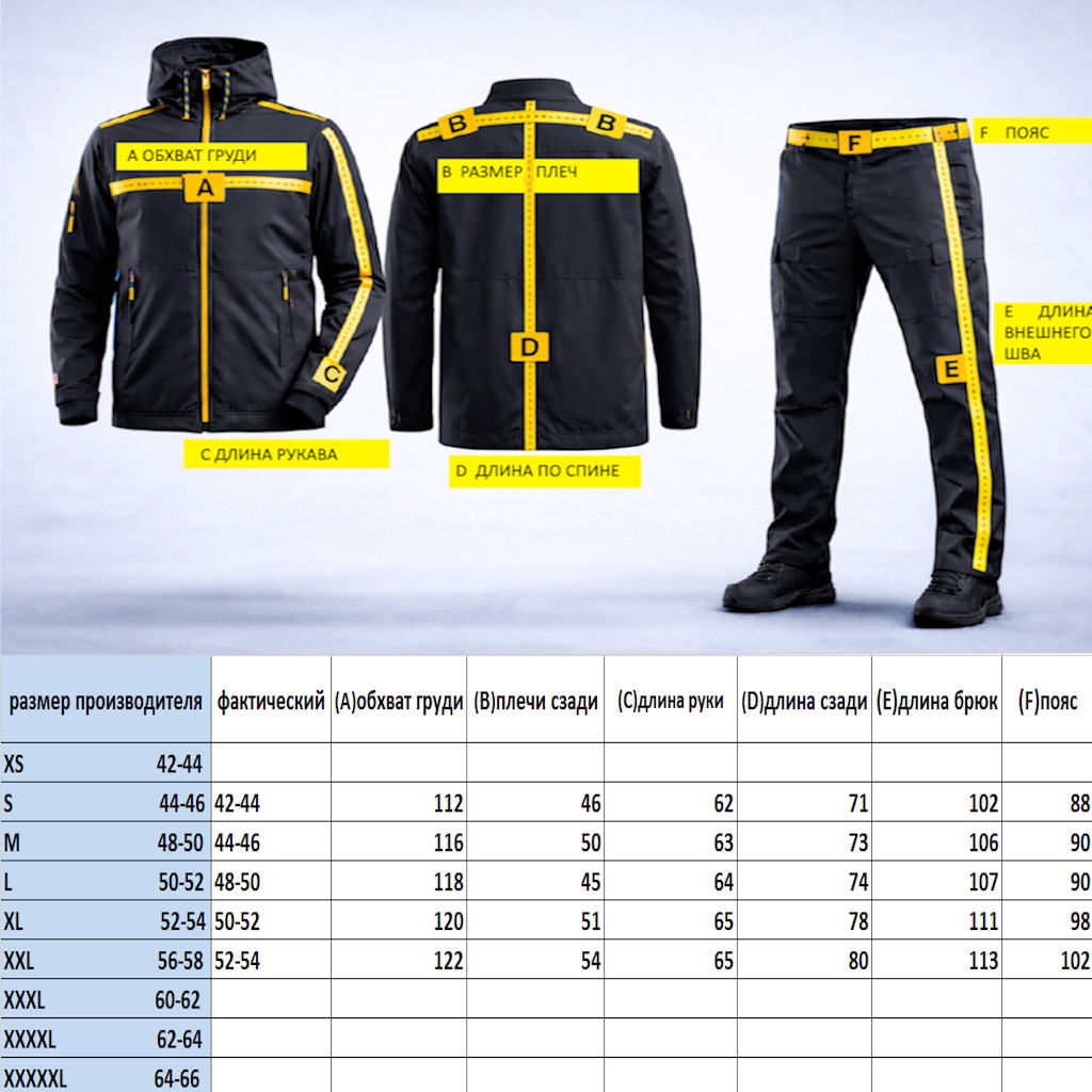 Костюм застегивается на молнию с ветрозащитным клапаном, верх имеет полуприлегающий силуэт, можно подтянуть область талии по фигуре. Воротник типа стойка не мешает движению шеи.