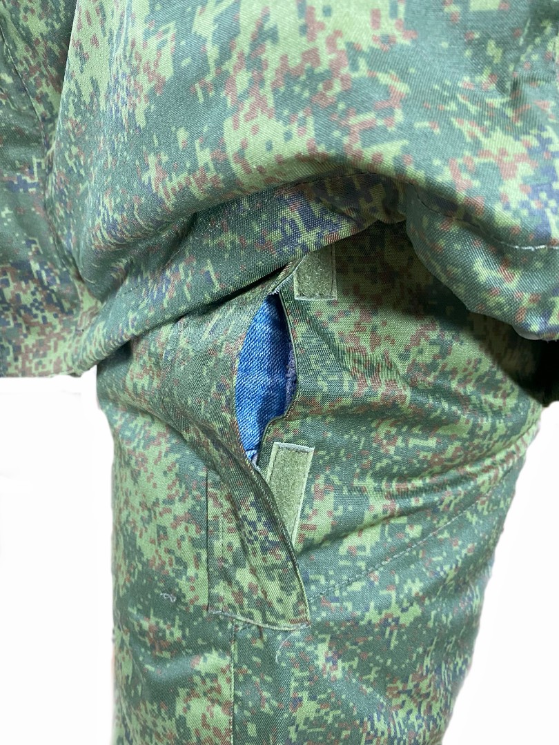 - Функциональные карманы: большие сквозные карманы на куртке защищены тканью, поясные карманы на брюках закрываются липучками для быстрого доступа и безопасности вещей.