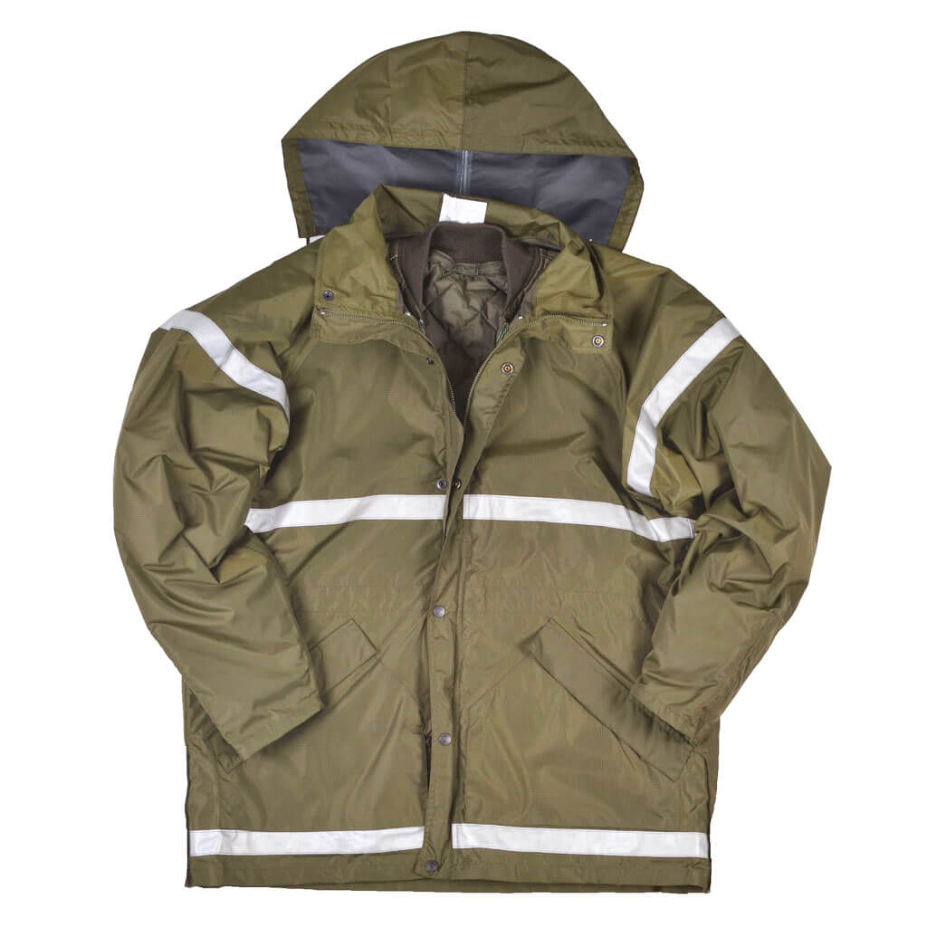 На куртке два внутренних кармана с внешними защитными клапанами, застежка на молнию и на кнопки, а также капюшон, который убирается в воротник.