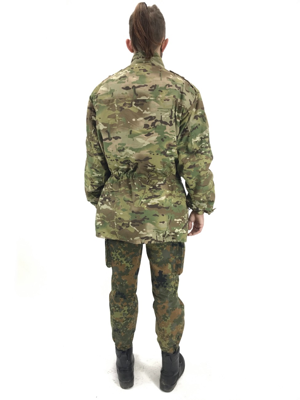 Голландская камуфлированная парка с непромокаемым и дышащим подкладом Gore-tex и теплым подкладом из полиакрила. застежка на молнии, на передней стороне четыре больших кармана с кнопками, один карман на рукаве,два ремешка на крючках и петлях на идентификационных этикетках,шнуровка на талии и по нижнему краю куртки.