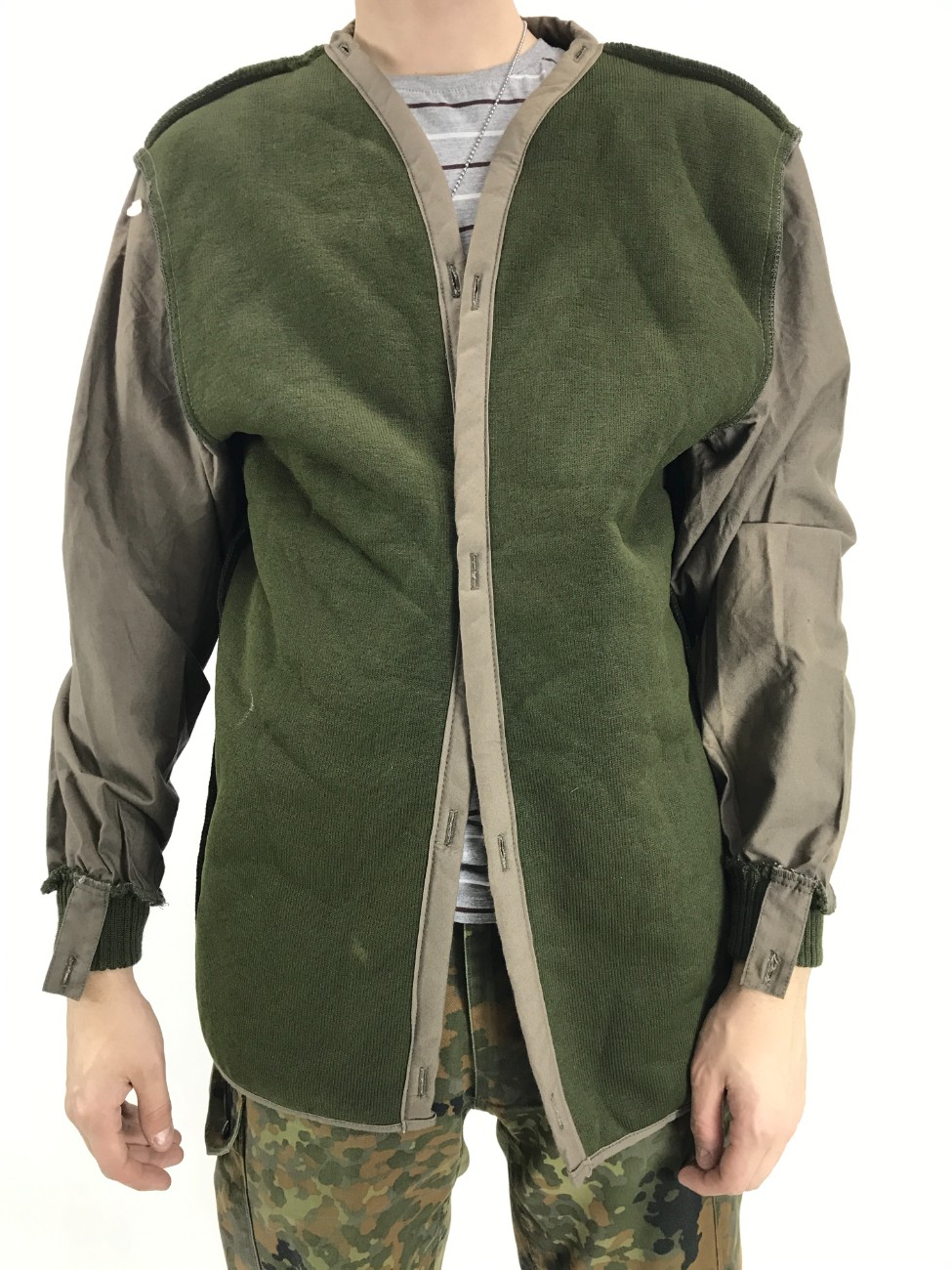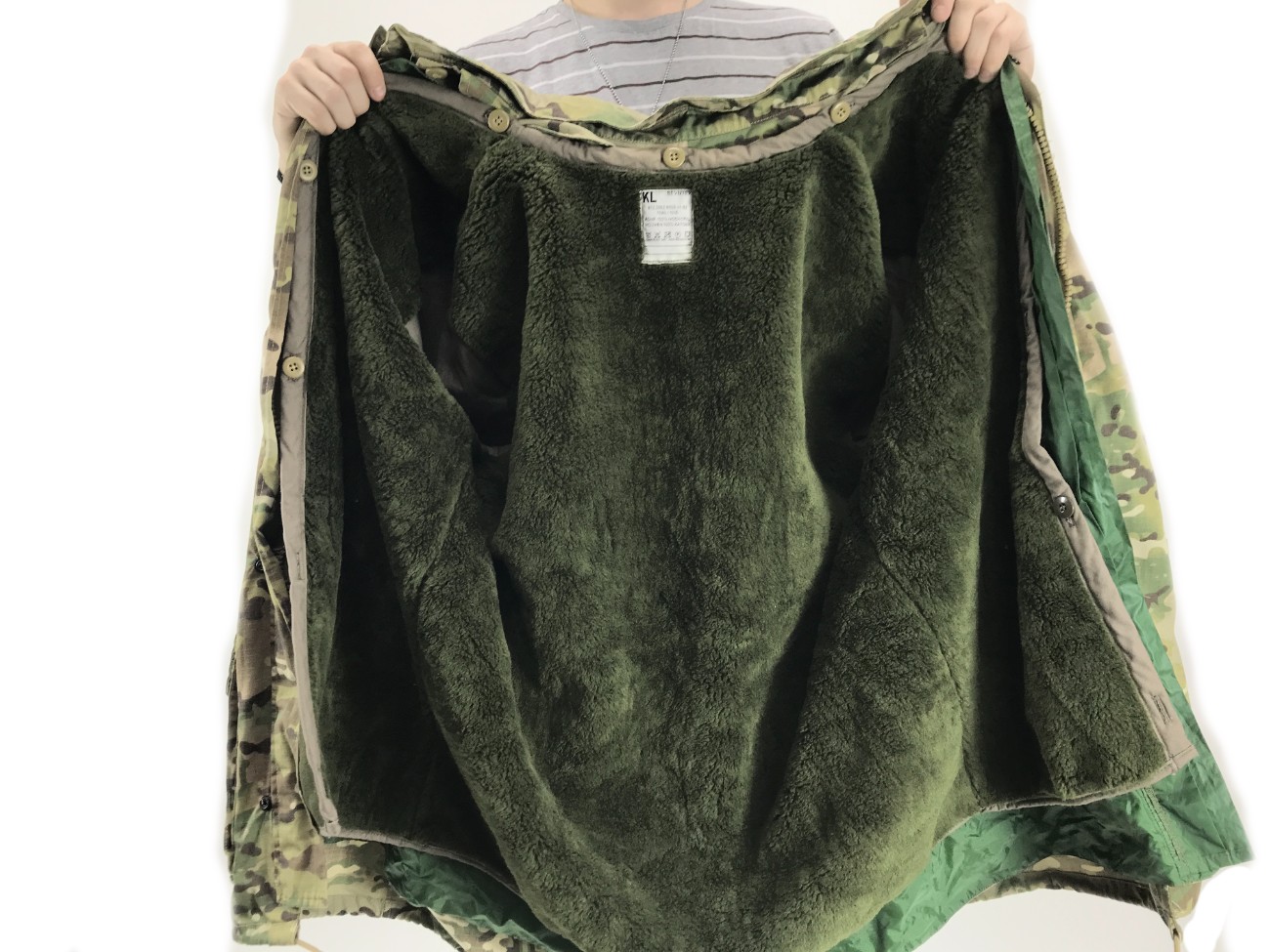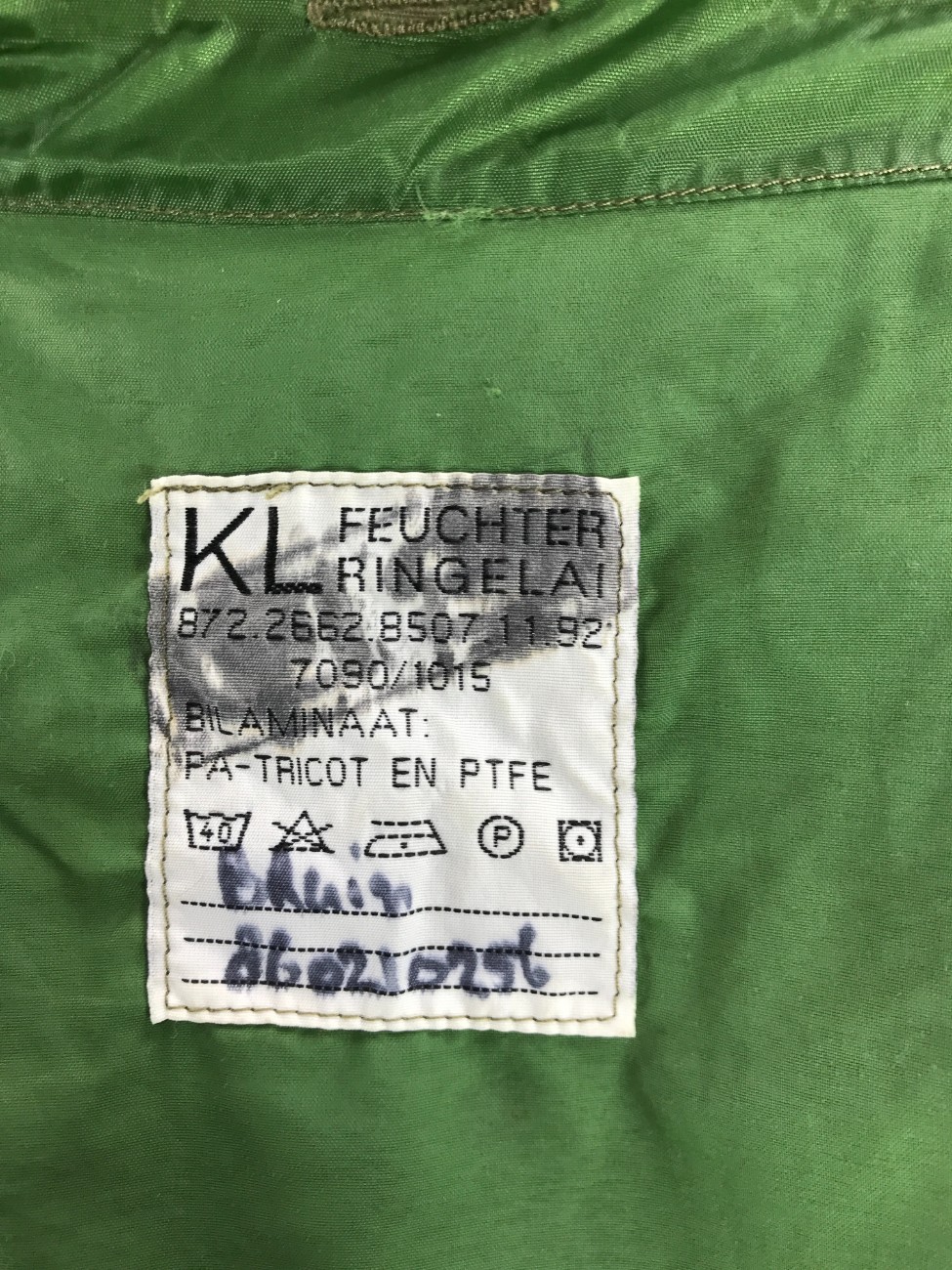 Куртка армии Нидерландов состоит из трех слоев: наружный камуфлированный слой из смесовой ткани (50% х/б, 50% синтетика), второй слой из водонепроницаемой "дышащей" мембранной ткани (типа Gore-Tex) и третий слой - утеплитель из искусственного меха.