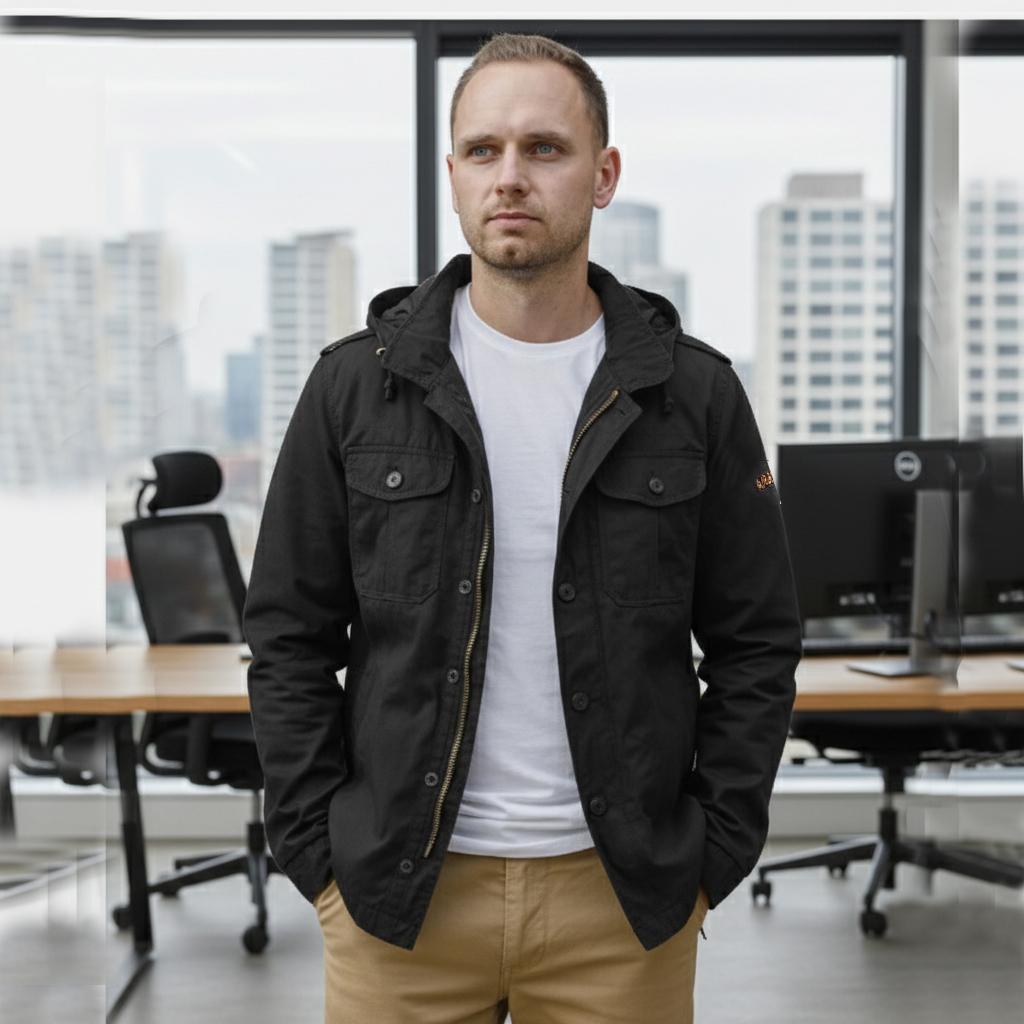 Стиль милитари — классический армейский силуэт и лаконичные детали создают образ уверенного и практичного человека.