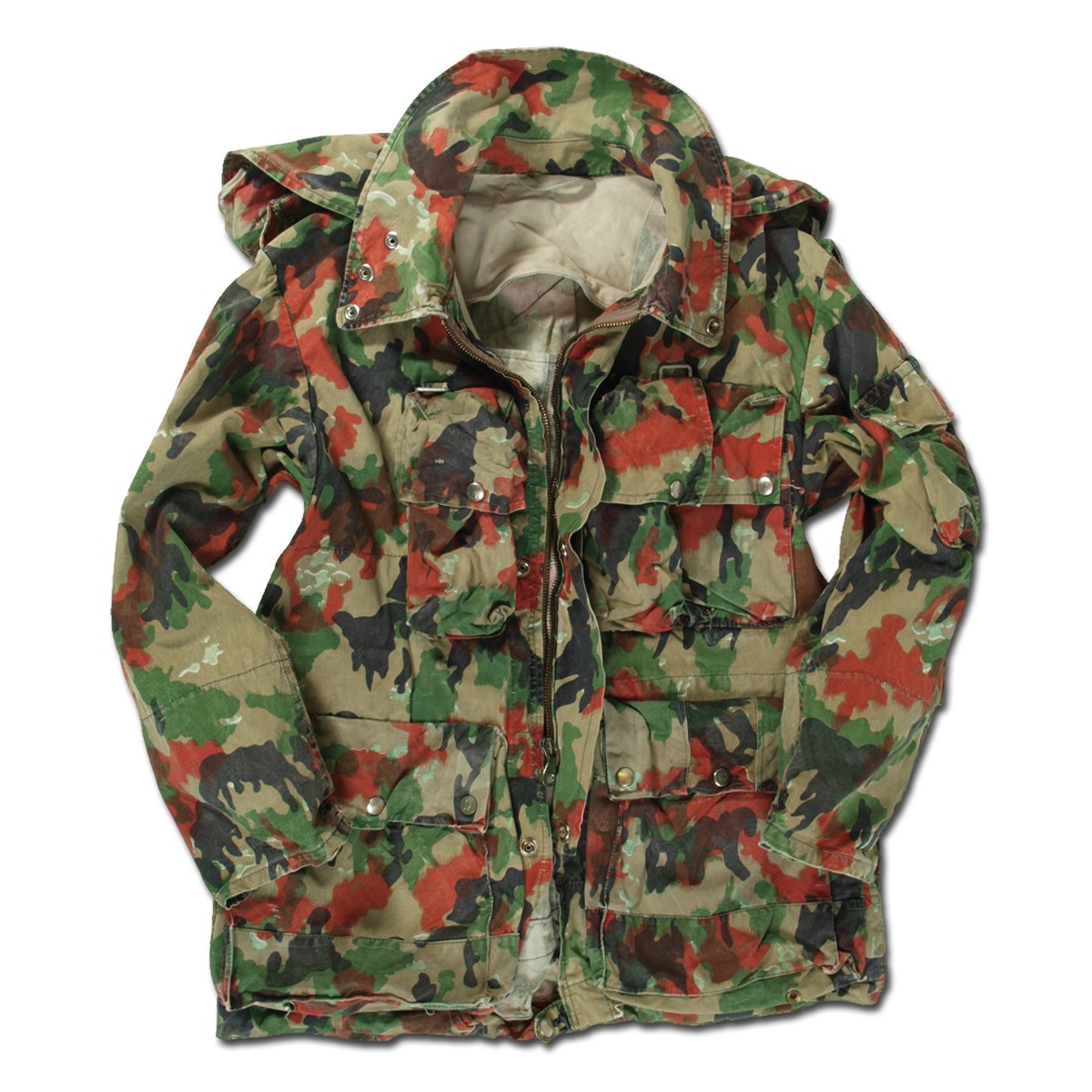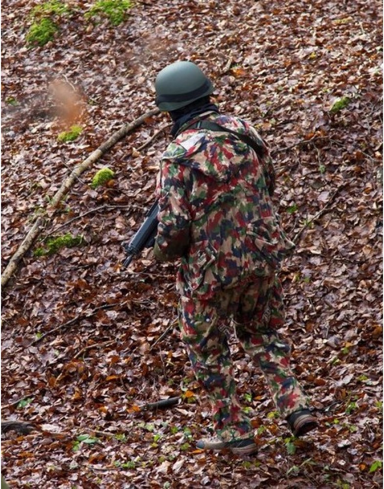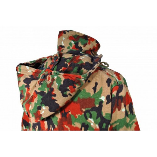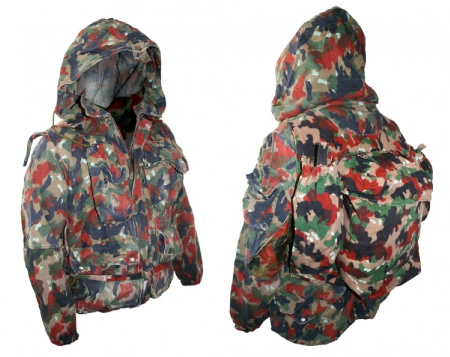 Маскировочная сетка для камуфлирования лица встроена в капюшон и зафиксирована в специальном отделении в капюшоне.