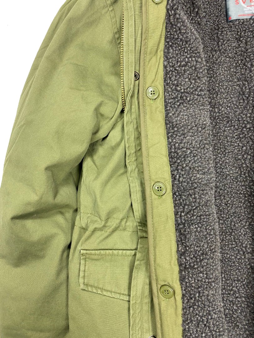 Внутри находится съёмная утеплённая подкладка из искусственной овчины (шерпы), которая эффективно сохраняет тепло при температуре до –10°C. Подкладка легко снимается с помощью пуговиц, позволяя использовать куртку как в зимний период, так и в прохладное межсезонье.
