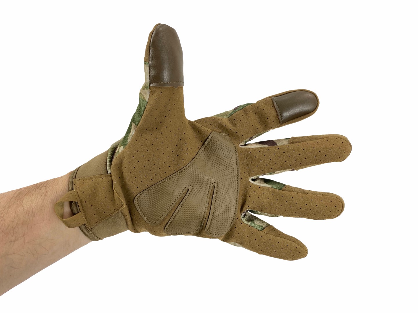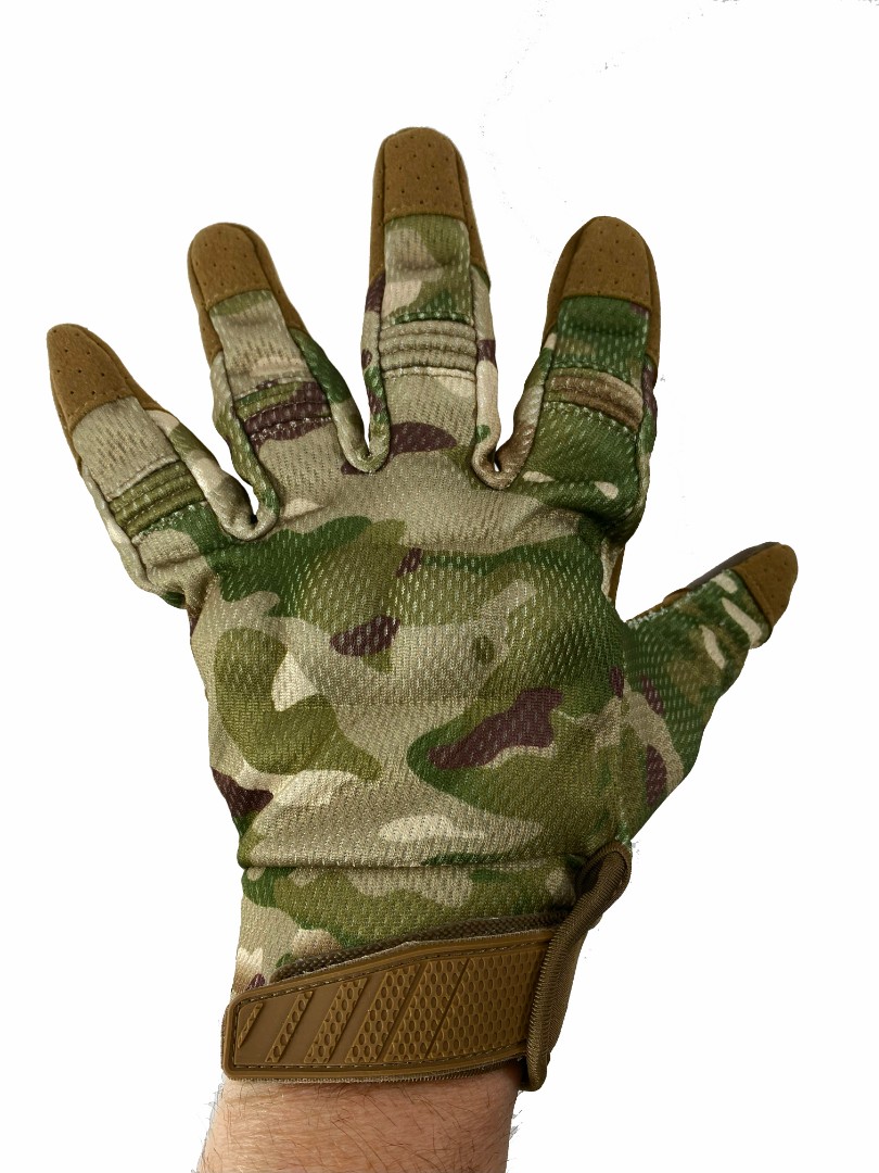 Тактические перчатки выполнены из перфрорированной ткани,что позволяет перчаткам вентилировать воздух.Ладони дополнительно усилены тканью для повышения износостойкости.Вшитые,пластиковые накладки на внешней стороне защищают кости от повреждений.Для удобного снятия/одевания перчатки предусмотрены липучки велкро.Тканевые петли позволяют пристёгивать перчатки к карабину,предотвращая потерю перчаток.