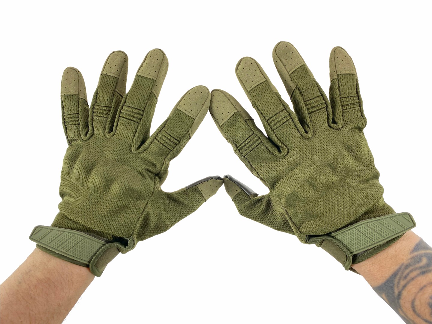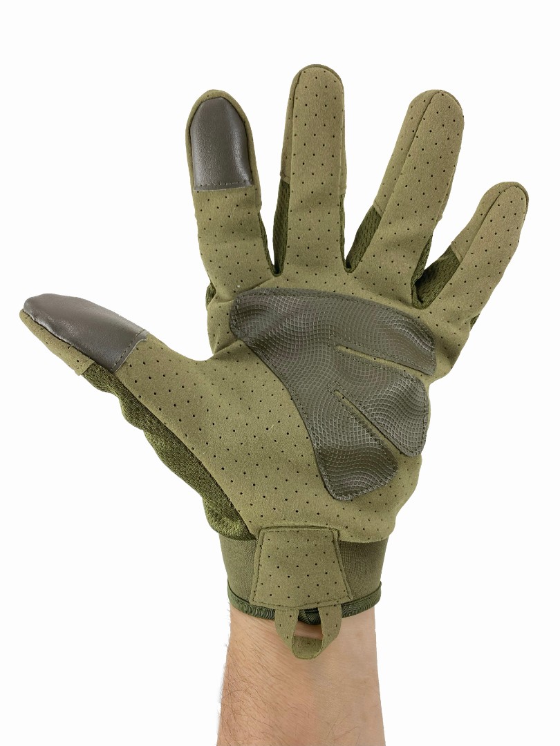 Тактические перчатки выполнены из перфрорированной ткани,что позволяет перчаткам вентилировать воздух.Ладони дополнительно усилены тканью для повышения износостойкости.Вшитые,пластиковые накладки на внешней стороне защищают кости от повреждений.Для удобного снятия/одевания перчатки предусмотрены липучки велкро.Тканевые петли позволяют пристёгивать перчатки к карабину,предотвращая потерю перчаток.