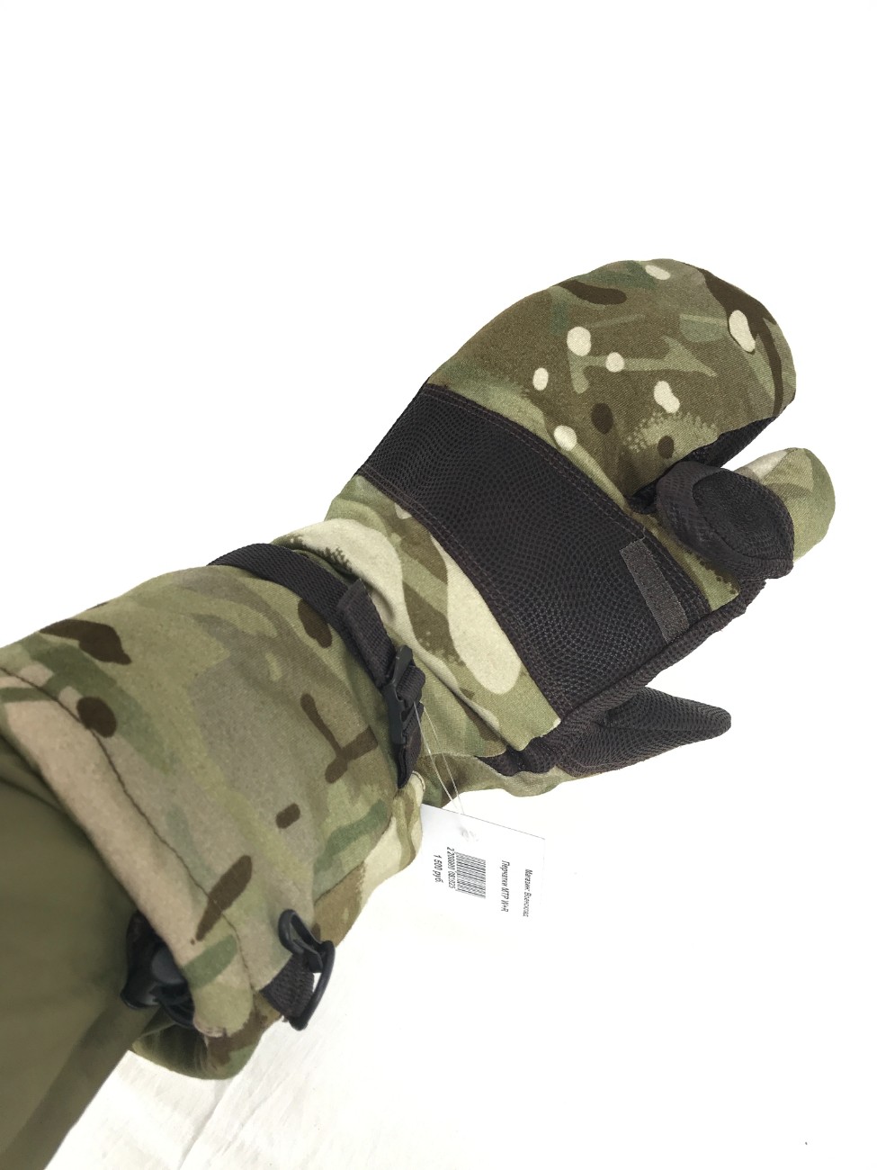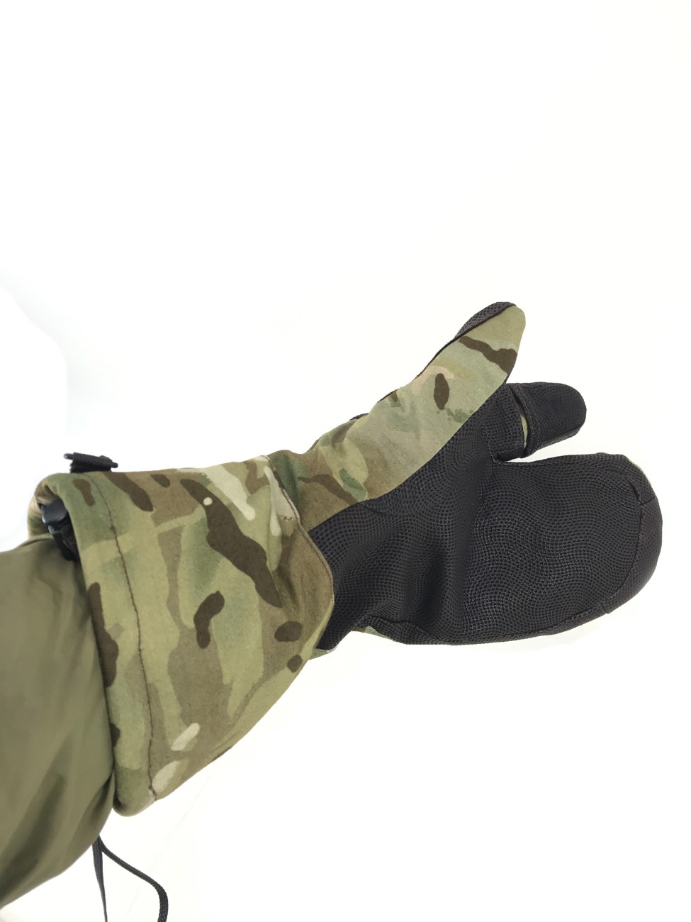 Изготовлены из влагостойкого материала, оснащены утеплителем и мембранной подкладкой Gore-tex. Область ладоней усилена кожей. Отдельное отделение для указательного пальца для стрельбы.