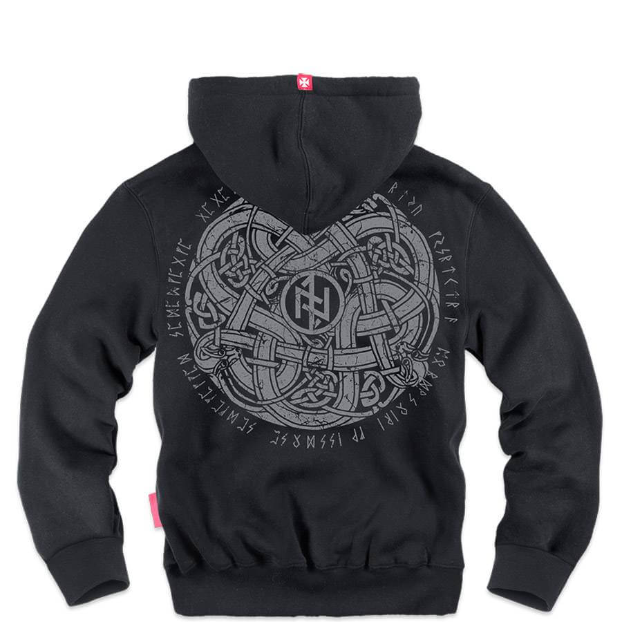 Хлопчатобумажная толстовка с молнией, капюшоном и двумя накладными карманами. Классическая модель, отделанная прочными трикотажными резинками. Имеет высокую стойку. У капюшона — шнурки и металлические кольца. Красные акценты в виде двух лейблов с логотипом марки, внутреннего плиссе и ярлыка с мотивом орла. На левой груди — небольшая, одноцветная графика в скандинавском стиле. Рисунок с мотивом нордических драконов, представляющий кельтские сплетения и рунические знаки. Сзади — такой же принт большего размера.