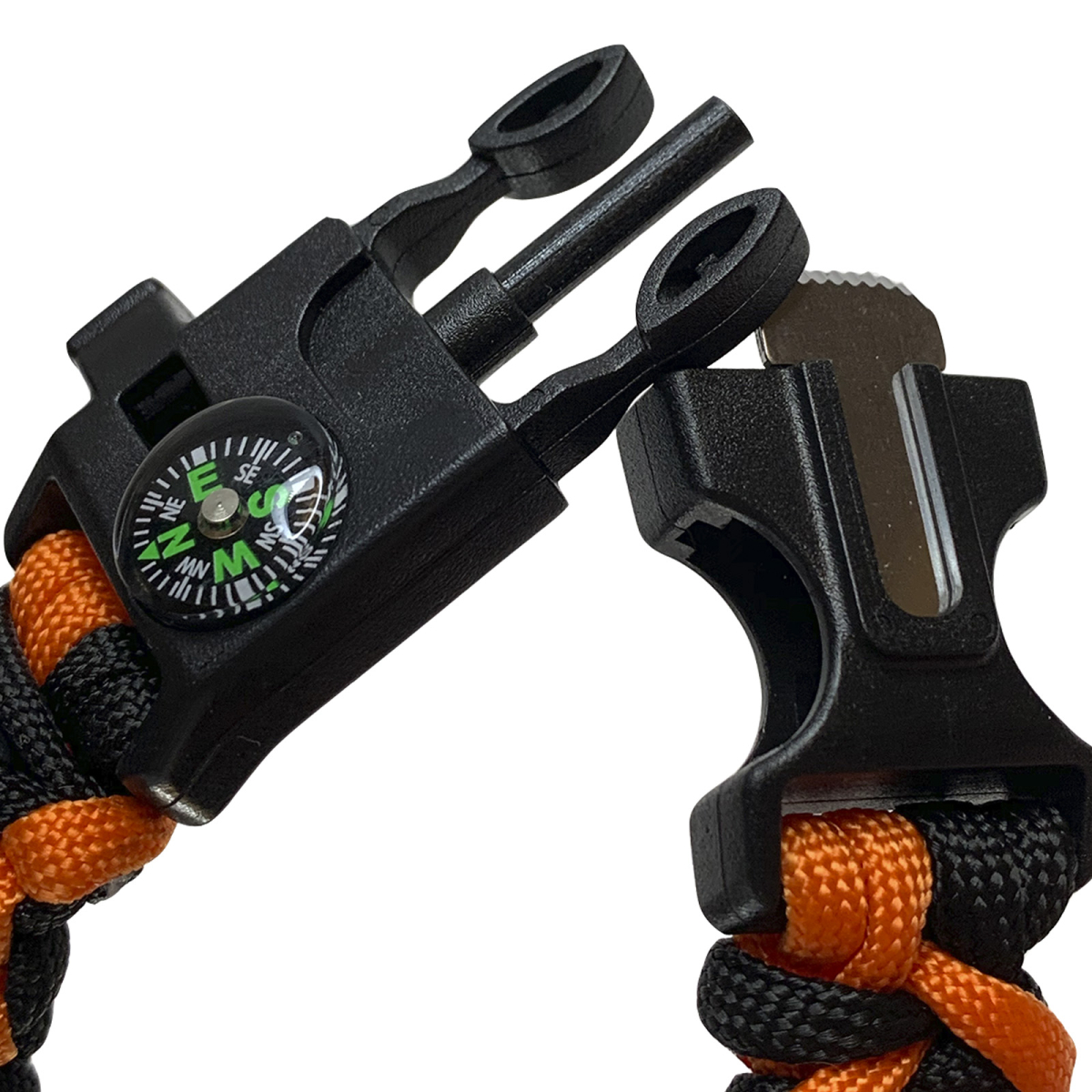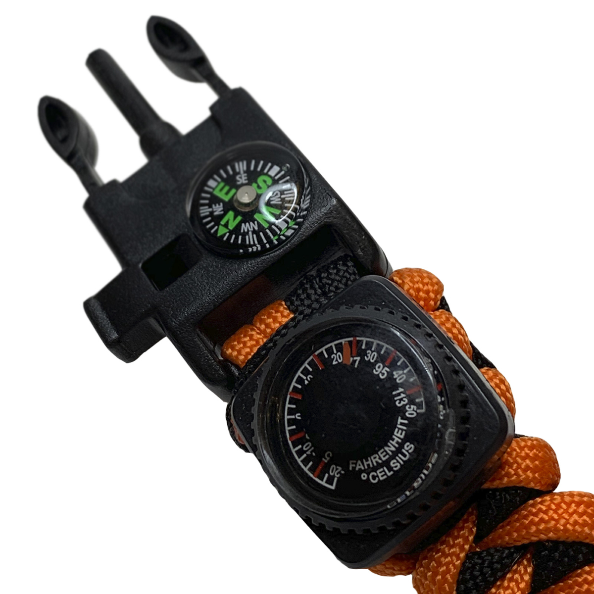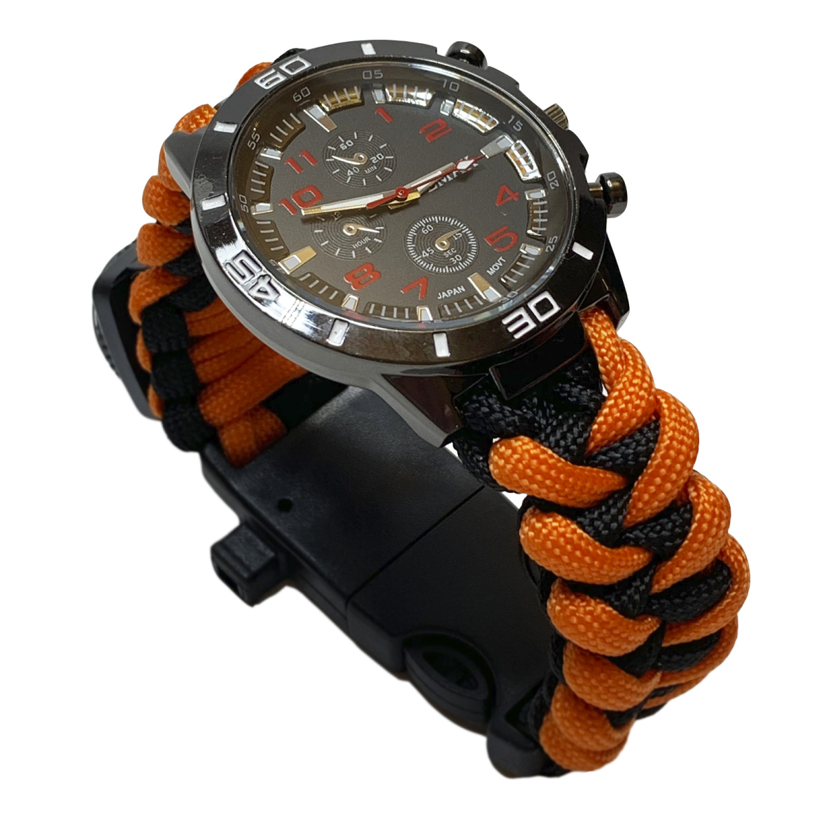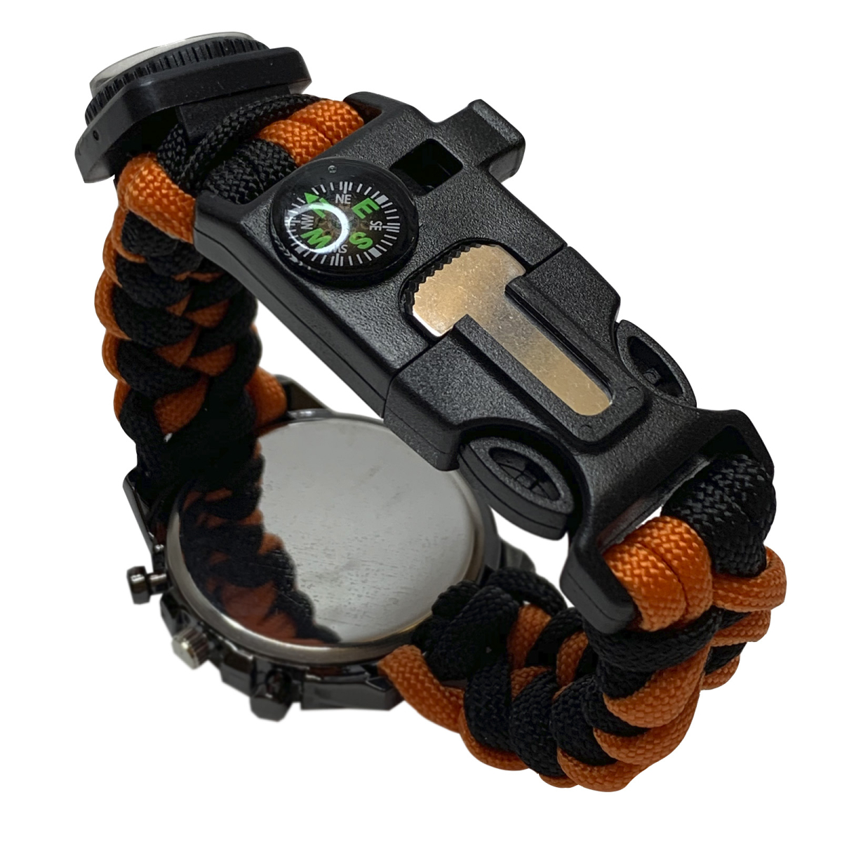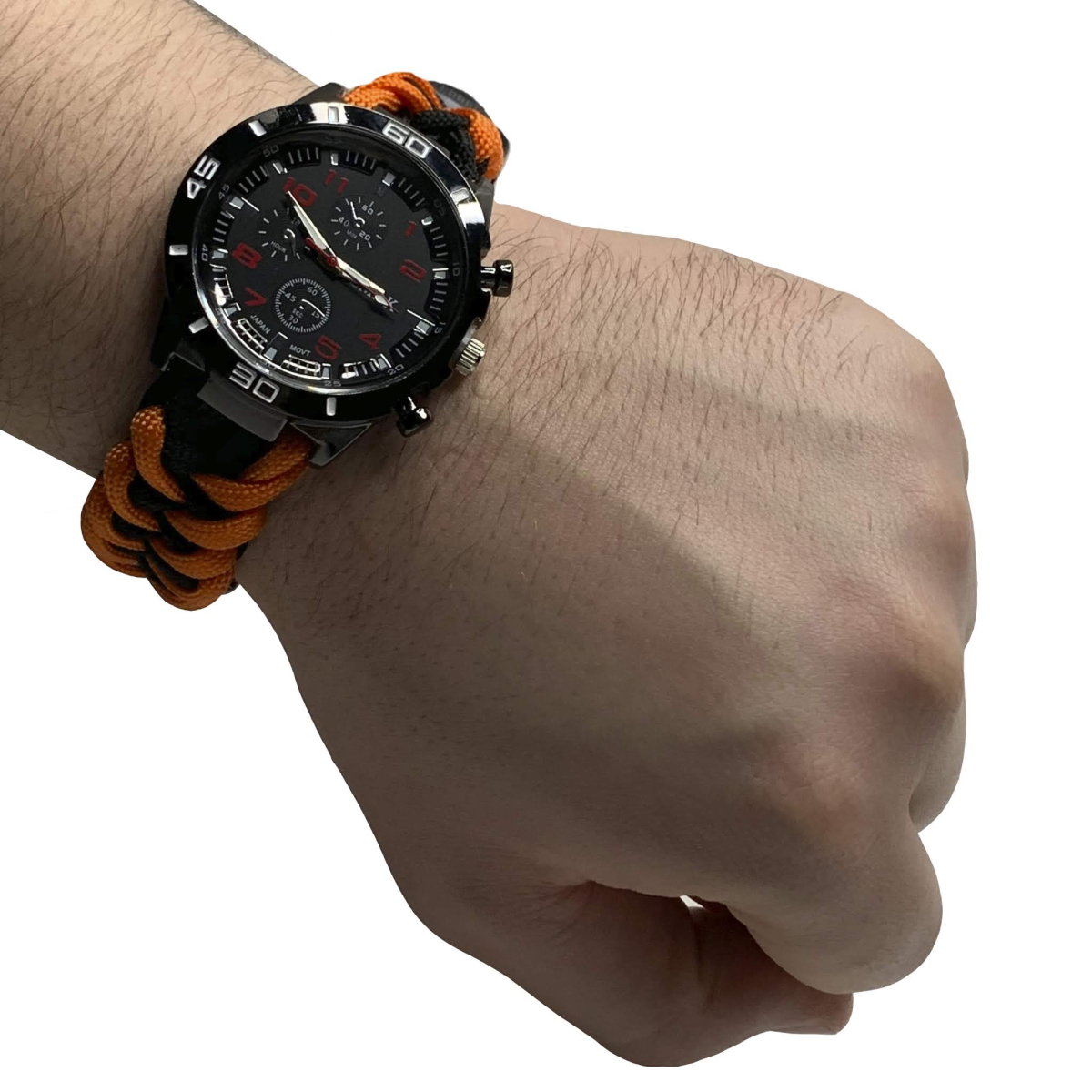 Тактические часы с набором выживания (оранжево-чёрный) — это многофункциональный инструмент для военных, туристов, охотников и всех, кто ценит готовность к любым обстоятельствам. В одном корпусе вы получаете точные противоударные часы и полный комплект аксессуаров для выживания: паракорд, компас, огниво, свисток и термометр.