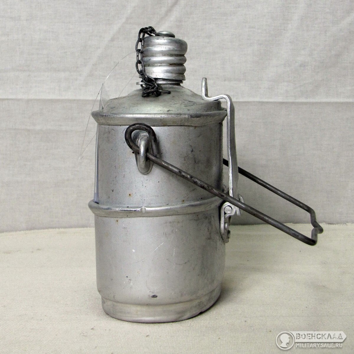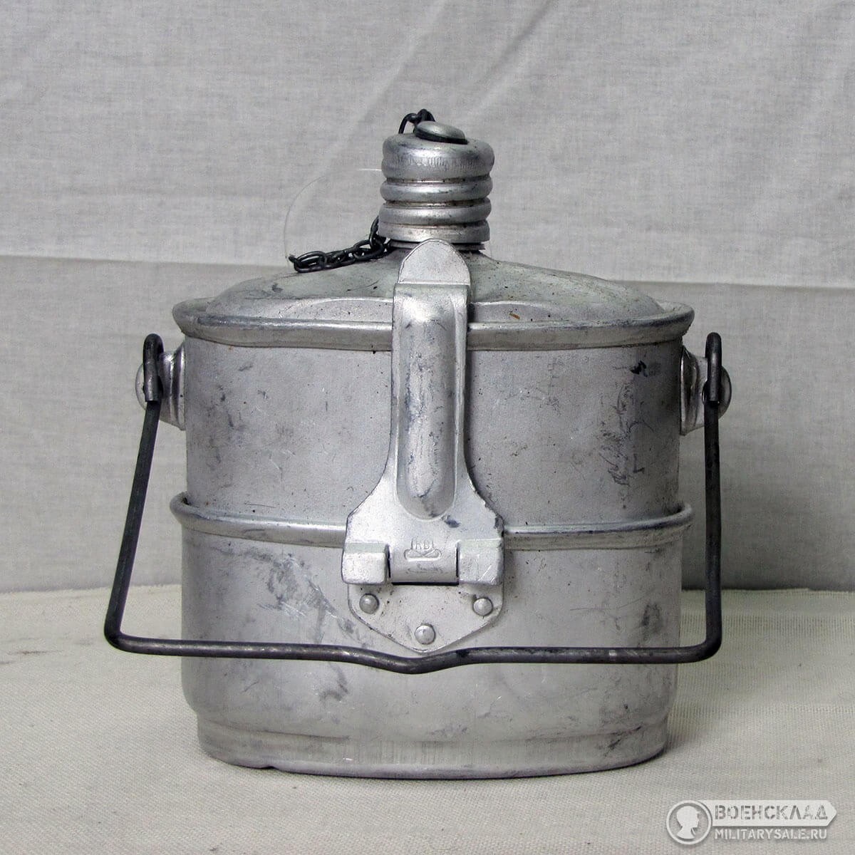 Фляга емкостью 1 литр внешне повторяющая внутренние габариты котелка. Материал – алюминий. Масса– 220 гр. В более поздних модификациях комплекта флягу стали делать пластиковую.