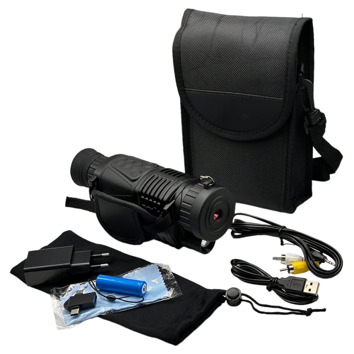 Комплектация: монокуляр, аккумулятор 14500, чехол, USB-кабель, зарядный блок, переходник microUSB/Type-C, салфетка для оптики