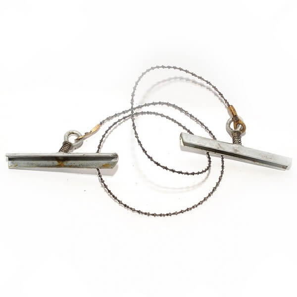Карманная пила изготовлена из цельного полотна для распила. Также имеются две металлические ручки из нержавеющей стали, к которым крепятся специальные петли. При помощи наконечников полотно пилы соединяется к петлям ручек. Хранится она в специальном чехле, что позволяет носить ее с собой даже в кармане униформы.