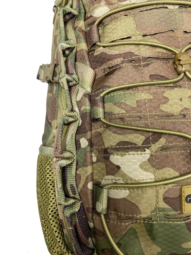 Изготовленный из передовых износостойких материалов (нейлон Hexagon 200D), рюкзак предлагает широкие возможности для модульной организации благодаря системе MOLLE. На фронтальной поверхности предусмотрено место под патч размером 95х170 мм.