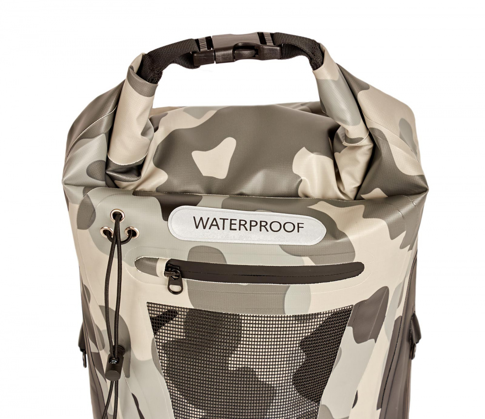 Вместительный герморюкзак для рыбалки. Абсолютно незаменим в дождливую погоду, а также на забродной рыбалке. Обеспечивает полную герметичность за счет скрутки верхней части гермомешка и фиксации ее на фастексе. Очень прочный современный материал тарпаулин с ПВХ покрытием. Оснащен удобной вентилируемой спинкой и широкими наплечными лямками. Имеет внешний карман из сетки, дополненный утяжкой и прорезной карман с влагозащитной молнией. Рюкзак оснащен светоотражающими элементами.