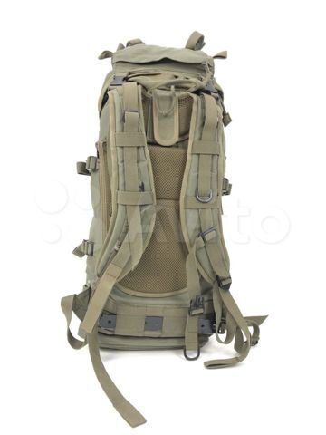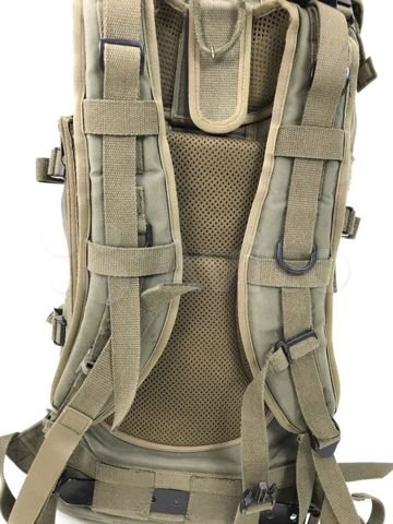 материал кордура на клапане, в нижней части, на боковых стенках расположены стяжки для крепления изомата, спального мешка, палатки, и т.п.- на передней части рюкзака система крепления для установки дополнительного снаряжения , кармана (большого или м-ки), чехла для лопаты, фляги, подсумков и т.д- 2 отделения, соединённые перегородкой со стяжкой- верхний клапан, прикреплённый к основному отделению на 4-х фастексах, регулируется по высоте.- малый карман в передней части рюкзака на липучке для кавера, на клапане, на днище рюкзака.- внутри основного отделения находится алюминиевый каркас для жёсткости спины, предусмотрена возможность регулировки рюкзака по росту.Cистема быстрого сброса. "дышащая" На спинке рюкзака предусмотрена быстроразьемная схема соединения рюкзака с тактическим поясом (тактический пояс в комплект не входит).Цвет хаки отлично подходит практичекси к любой расцветке камуфляжа .