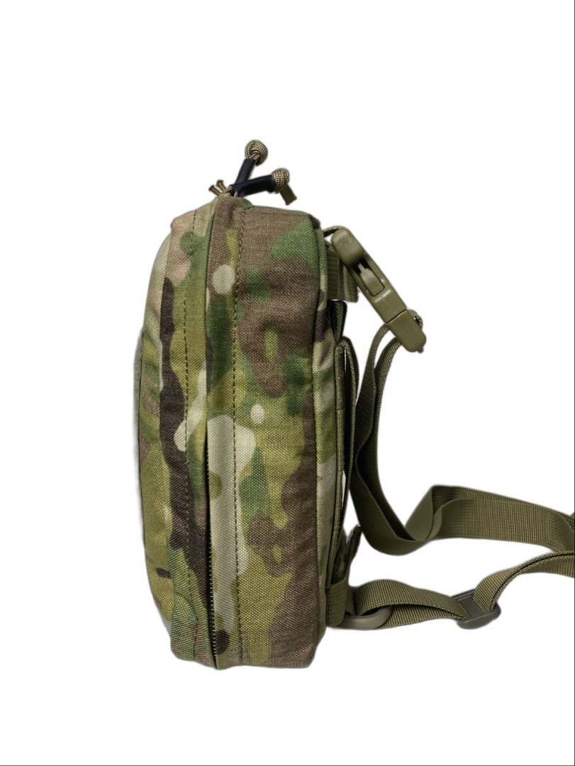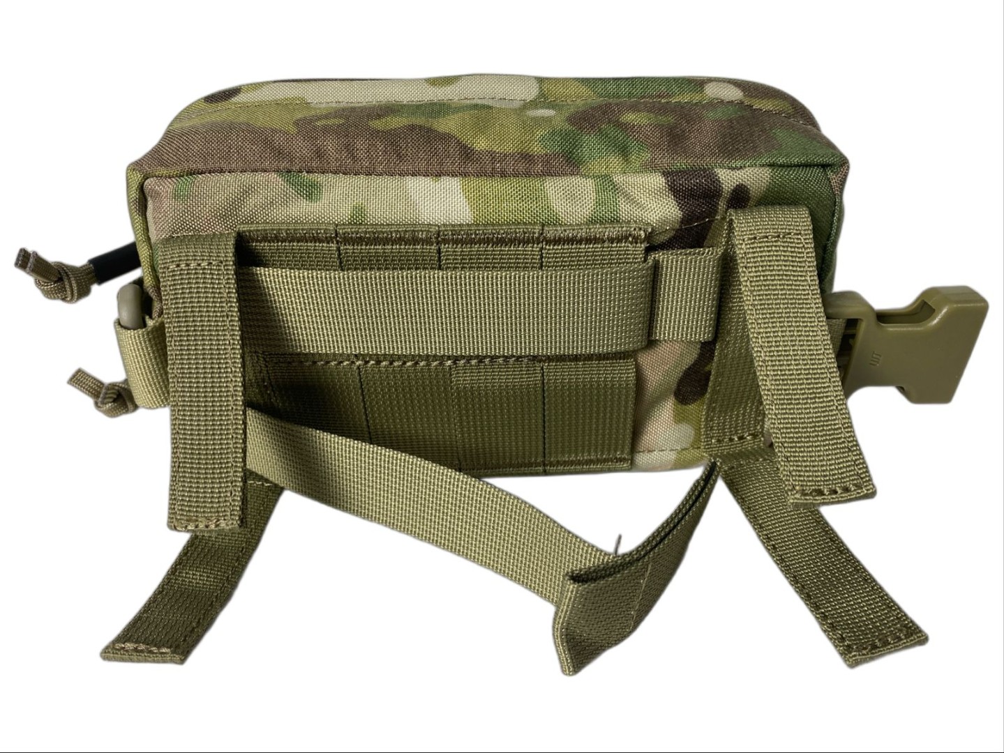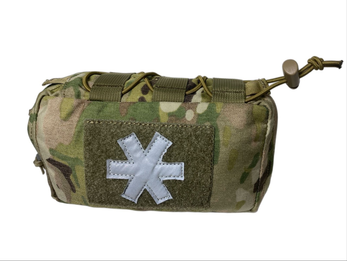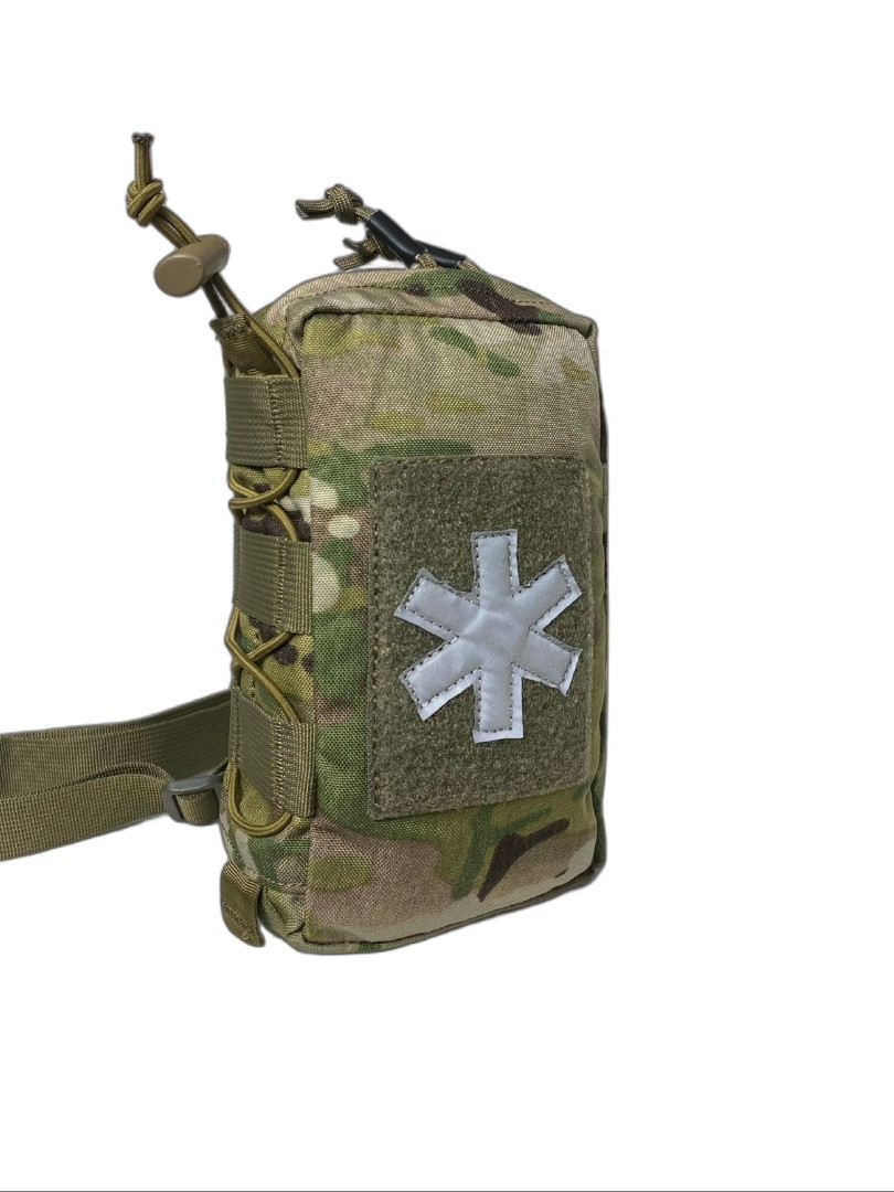 Медицинский подсумок для медикаментов и оказания первой помощи представляет из себя сам подсумок и внутренний раскладывающийся вкладыш. Подсумок выполнен из нейлоновой ткани Cordura плотностью 500 D, которая отличается повышенной износостойкостью. Система Molle позволяет интегрировать подсумок со всевозможными вещами: рюкзак, бронежилет и т. п. Регулируемый ремень позволяет носить подсумок на поясе или носить как сумку через плечо. Вертикальные шлейки на велкро плотно фиксируют подсумок на поясе. Двухсторонняя молния облегчает доступ к содержимому. Задняя часть сумки дополнена полимерной пластинкой, на передней панели расположена велкро с нашитым значком медика. На боковой части подсумка расположены петли с утягивающей резинкой,которые могут использоваться для хранения химического света. Во внутренней части подсумка расположен вкладыш и сетчатый карман с плотным и эластичным кантом.