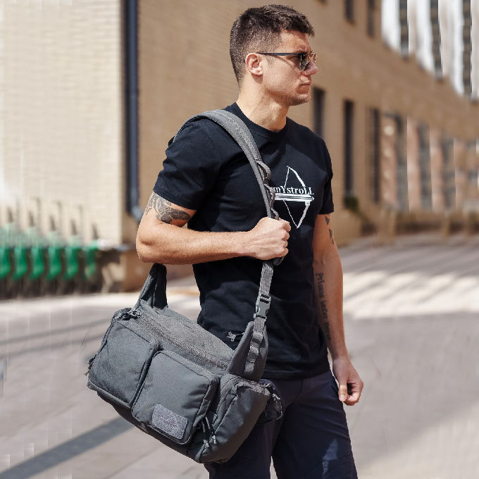 Сумка представлена в трех расцветках — черной, серой и хаки, которые отлично сочетаются как с повседневным, так и с тактическим'