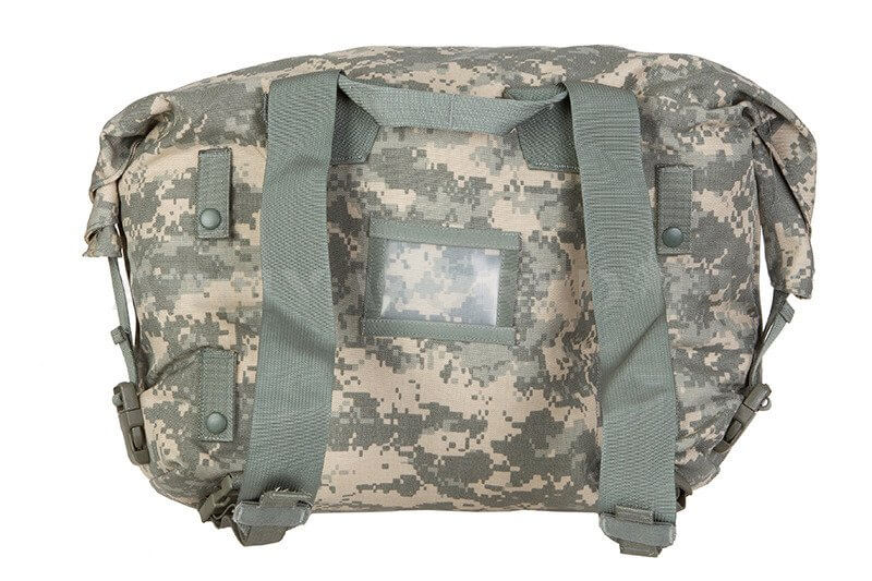 Изготовлен из прочного материала типа Cordura, гуммированного внутри. Закрыт с возможностью скатывания и закрепления верхнего воротника.