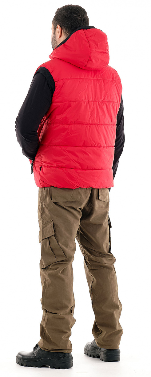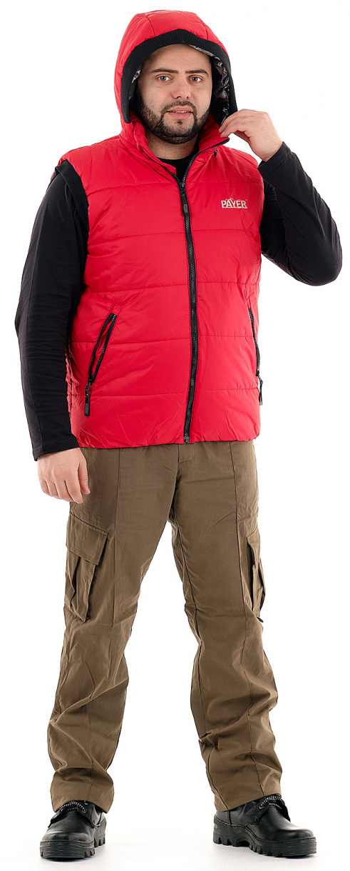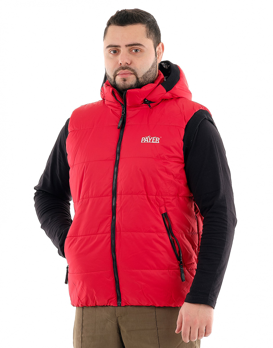 На отстегивающемся капюшоне также есть отделка эластичным трикотажем. Низ жилета собран на резинку. Карманы закрываются на молнию. На полочке вышит фирменный логотип «PAYER».