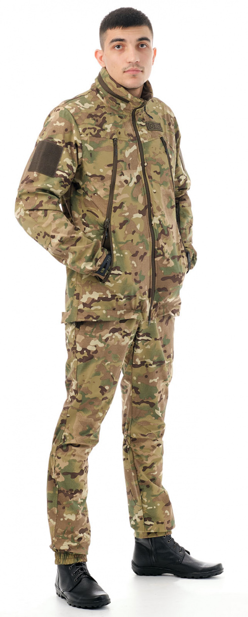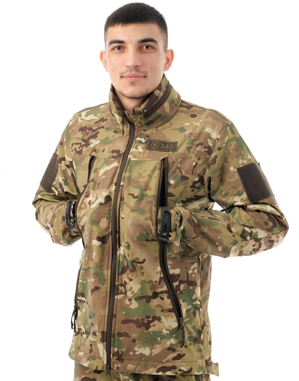 Костюм «Альфа» тактического направления (ТМ 7.62) из современного инновационного материала софт-шелл, представляющего собой единое полотно из трех слоев: трикотаж, мембрана, трикотаж. Такое сочетание обеспечивает защиту от порывов ветра и дождя, отличное влагоотведение, сохранение тепла. Само изделие при этом имеет небольшой вес (компактное) и эластичность (не стесняет движений). Тефлоновая обработка костюма позволяет каплям воды и загрязнений легко скатываться с поверхности, уменьшая таким образом количество стирок.