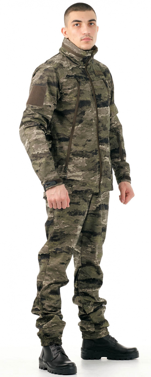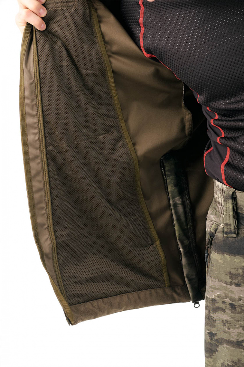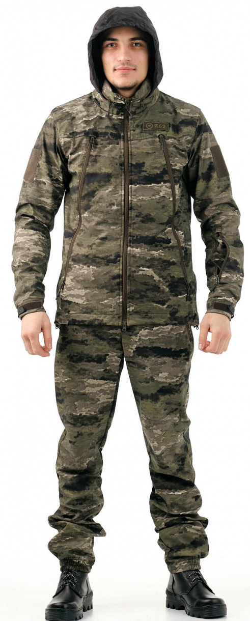 Костюм «Альфа» тактического направления (ТМ 7.62) из современного инновационного материала софт-шелл, представляющего собой единое полотно из трех слоев: трикотаж, мембрана, трикотаж. Такое сочетание обеспечивает защиту от порывов ветра и дождя, отличное влагоотведение, сохранение тепла. Само изделие при этом имеет небольшой вес (компактное) и эластичность (не стесняет движений). Тефлоновая обработка костюма позволяет каплям воды и загрязнений легко скатываться с поверхности, уменьшая таким образом количество стирок.