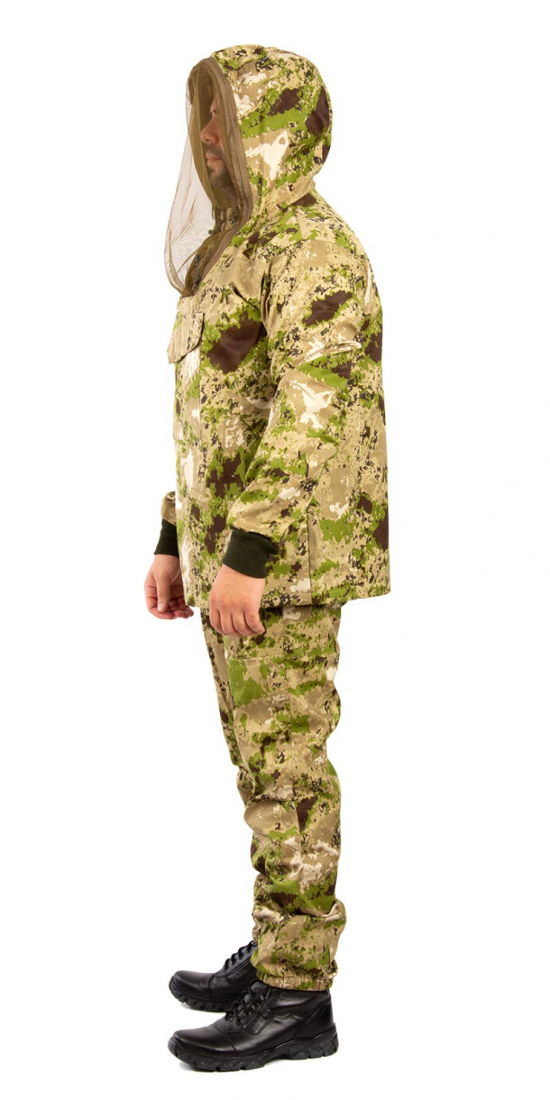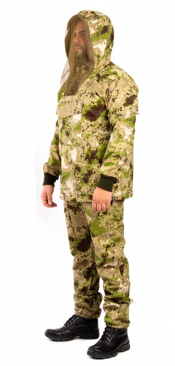 Сетка накомарника съемная и легко убирается в потайной карман. Плотная ткань создает надежную защиту, позволяет телу «дышать» и надежно защищает от насекомых. Рукава оснащены плотными трикотажными манжетами. Этот костюм отлично подойдет для всех, кто много бывает в лесу.
