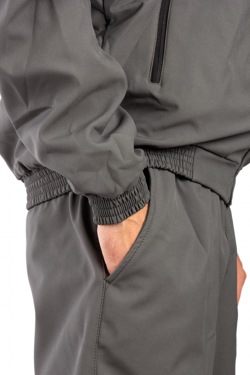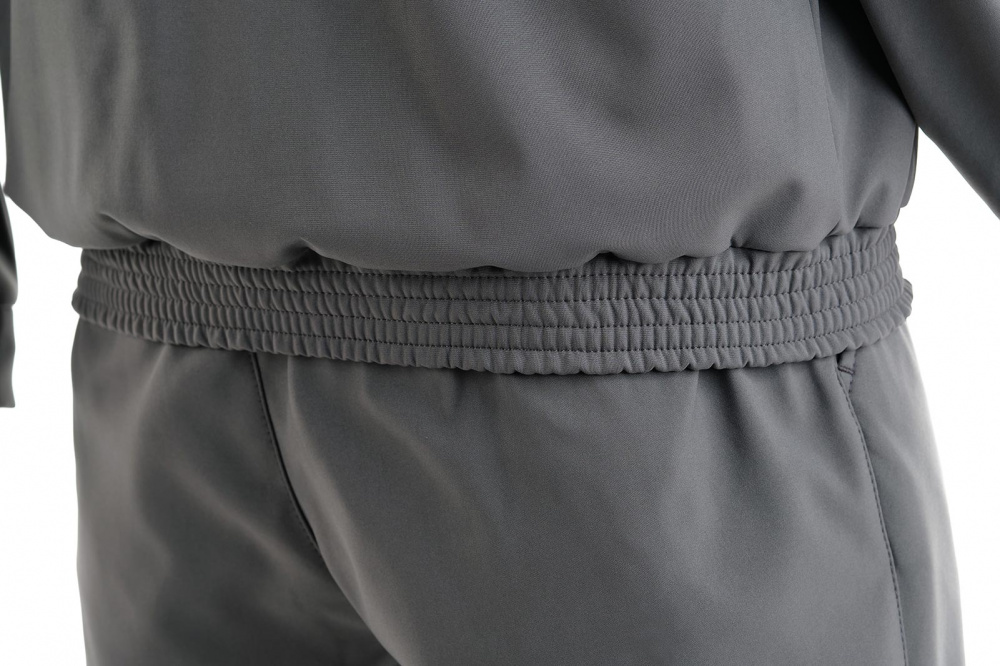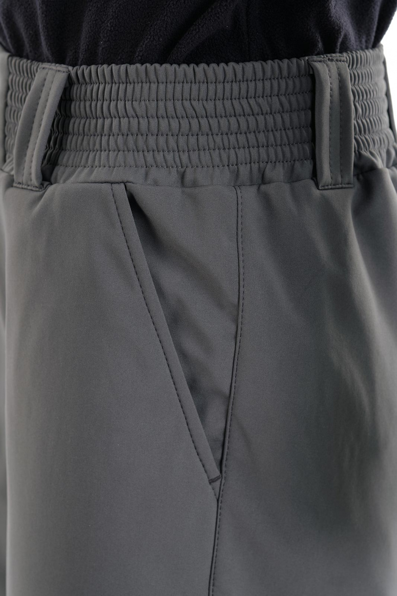 Брюки по низу регулируются утяжками. Пояс брюк на широкой простроченной резинке, дополнен шлевками. Два кармана у пояса без застежки.