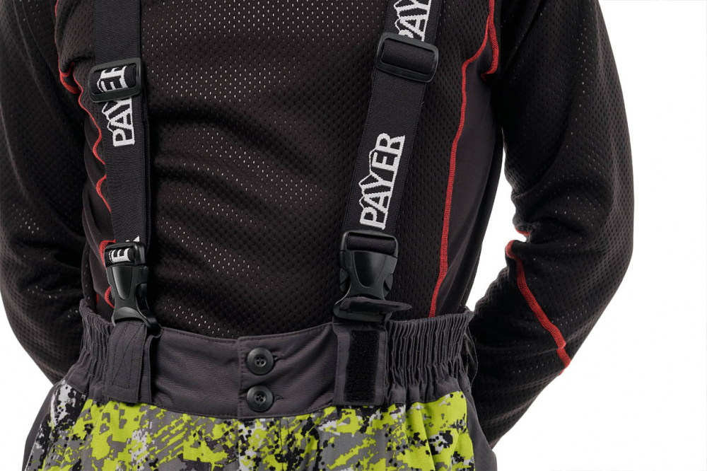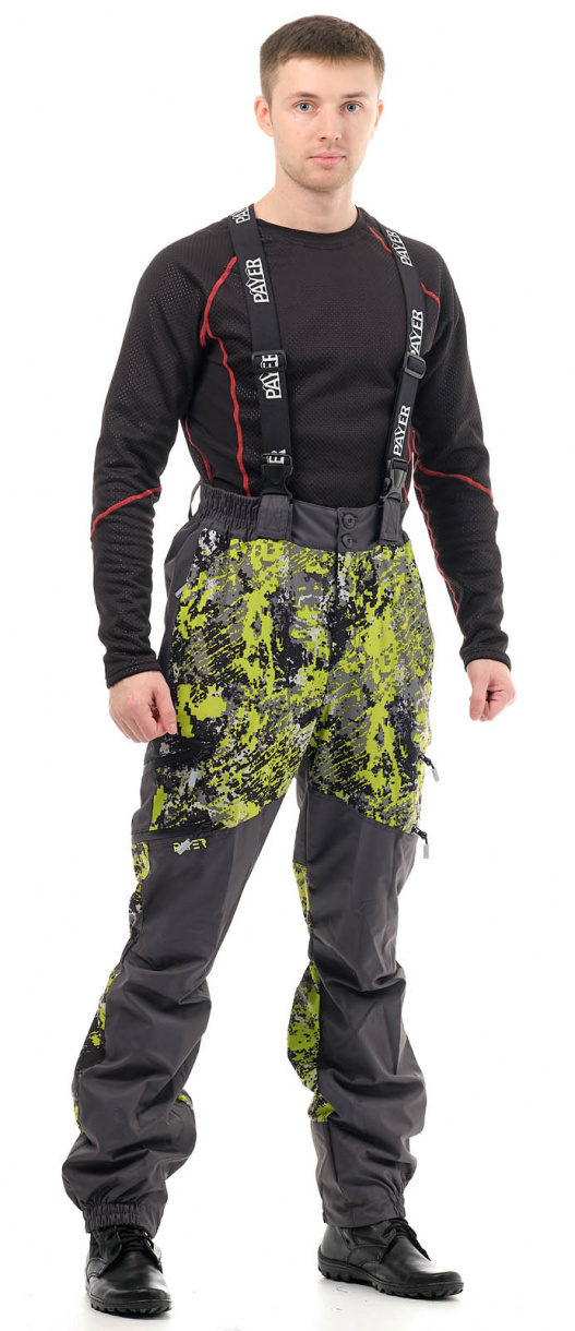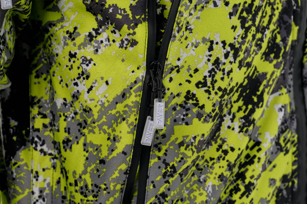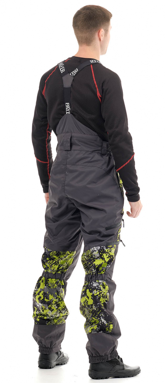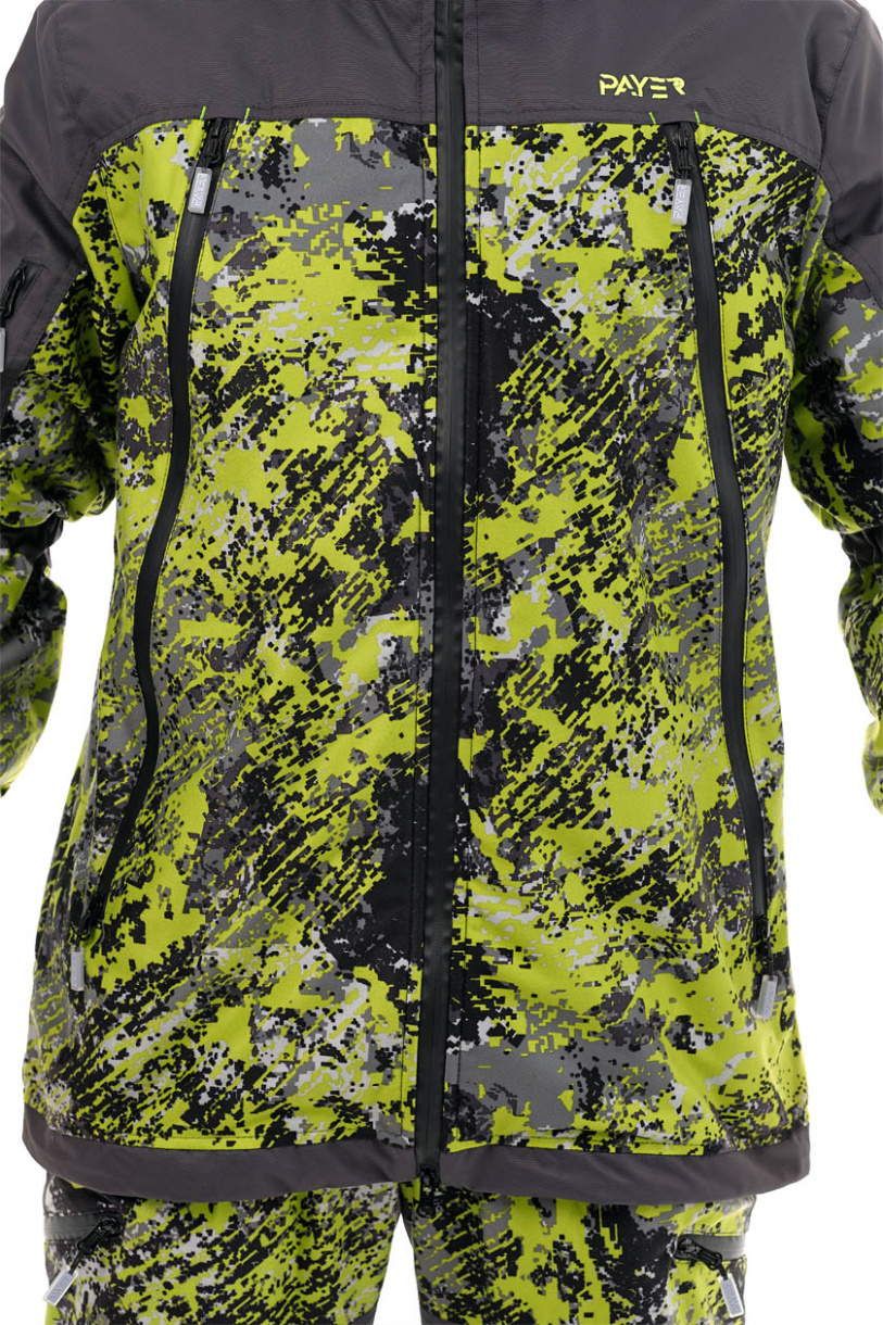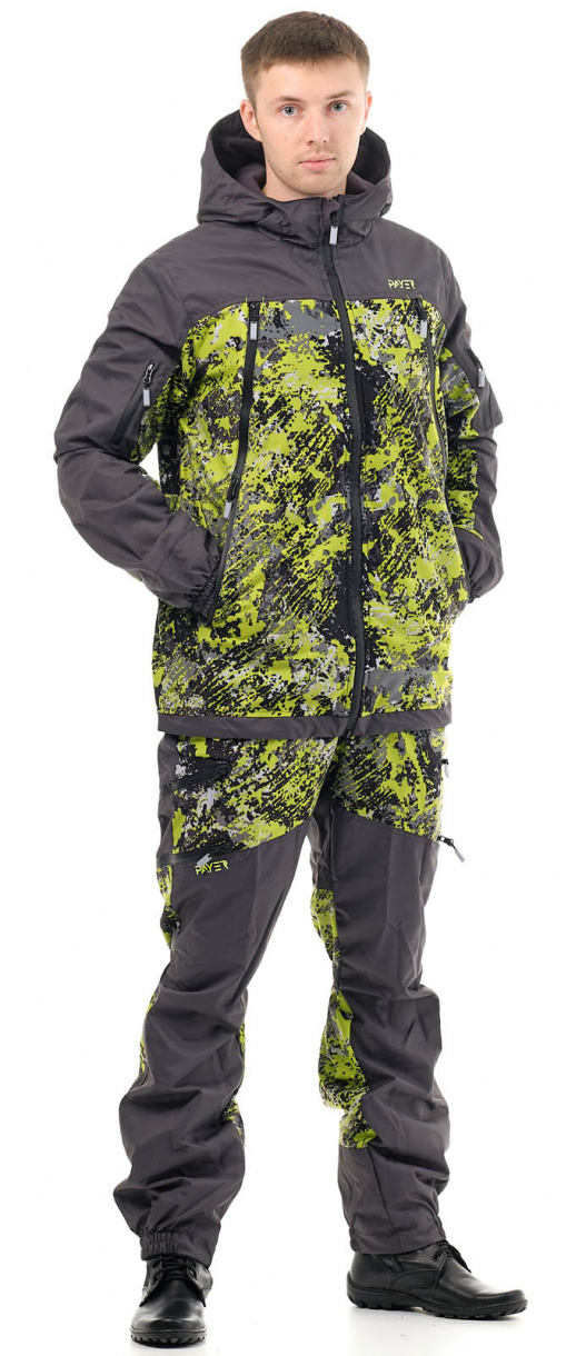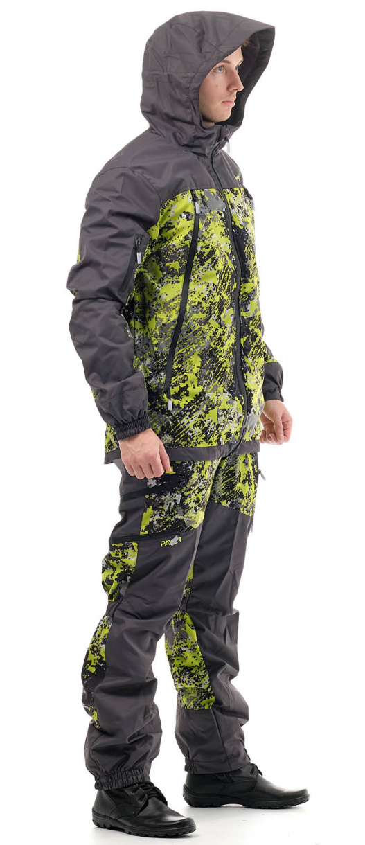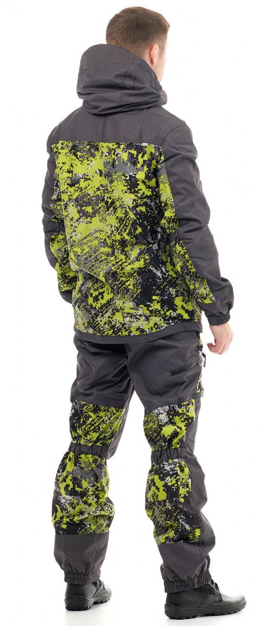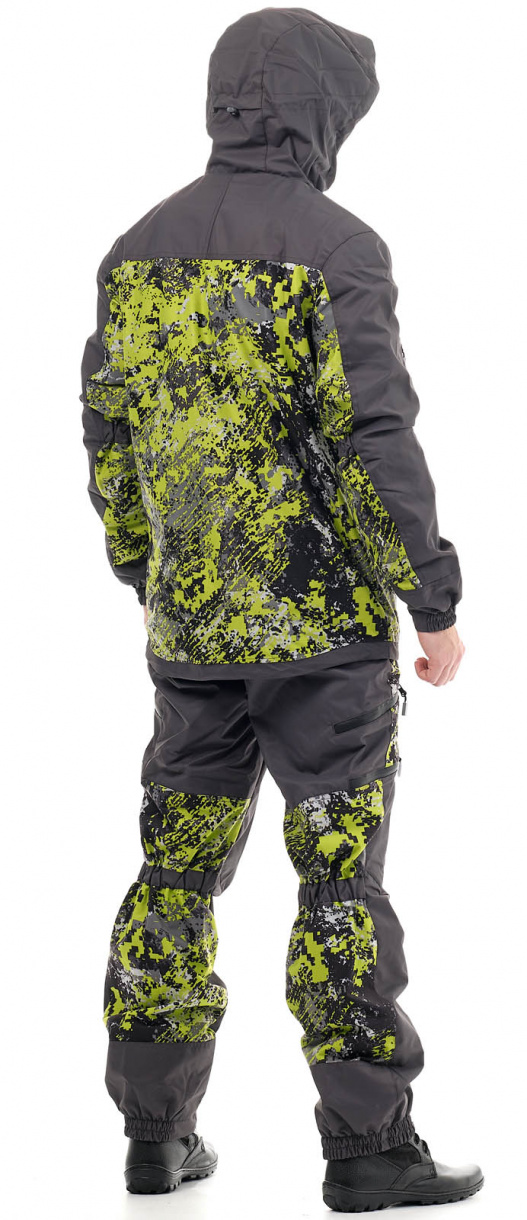 Костюм состоит из куртки и брюк. Куртка удлинена на спине. За счет утяжек на рукавах и капюшоне хорошо прилегает к телу, но не сковывает движения. Анатомический крой брюк укреплен подтяжками и широким поясом для комфортной посадки по фигуре. Козырек капюшона уплотнен, сам капюшон регулируется утяжками, вшитыми в складки.