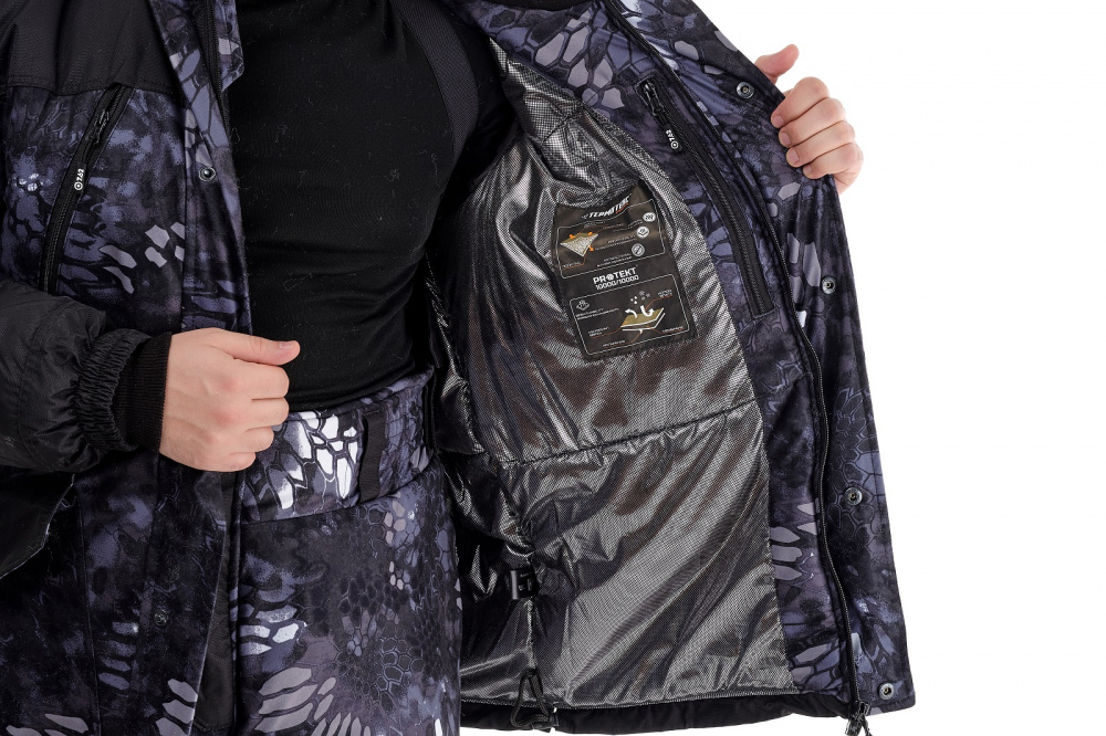 Подклад: фольгированный подклад (100% ПЭ, в «теле» куртки, плотность 60 г/кв.м), флис (в капюшоне, 100% ПЭ, плотность 130 г/кв.м), таффета (в брюках и рукавах, плотность 60 г/кв.м, 100% ПЭ)