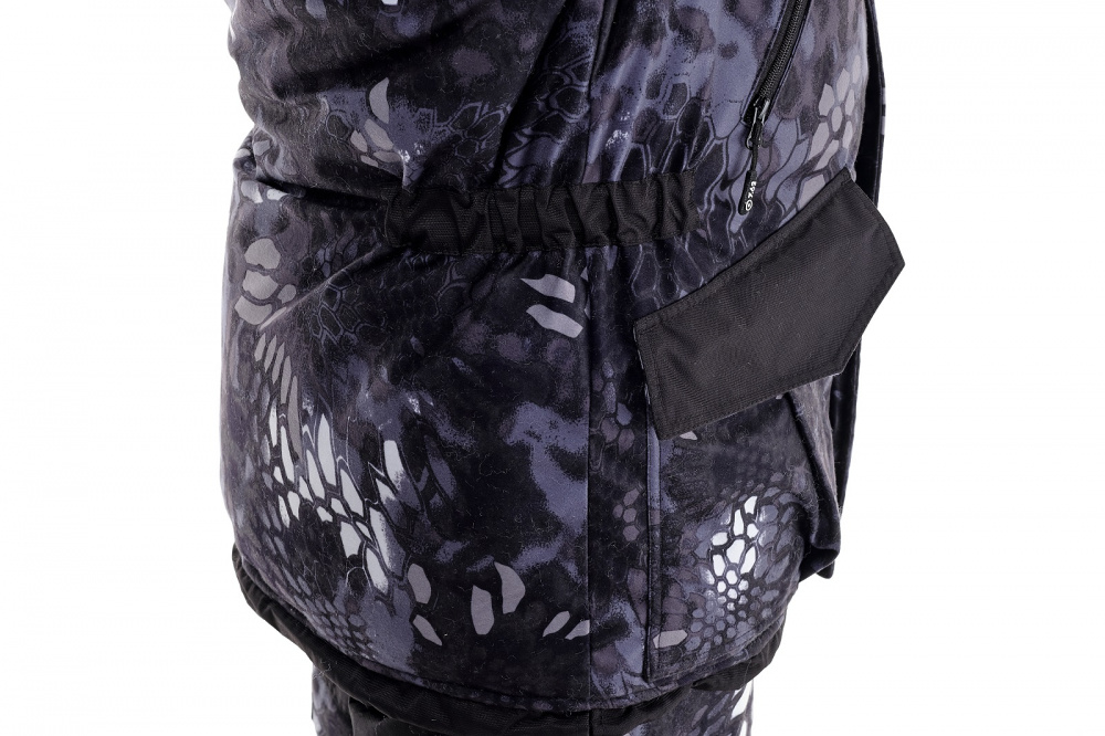 Удлиненная куртка собрана в области талии по бокам на кулисы с резинками. Низ куртки регулируется шнуром с фиксаторами по бокам. Также препятствуют проникновению холода двойная ветрозащитная планка.