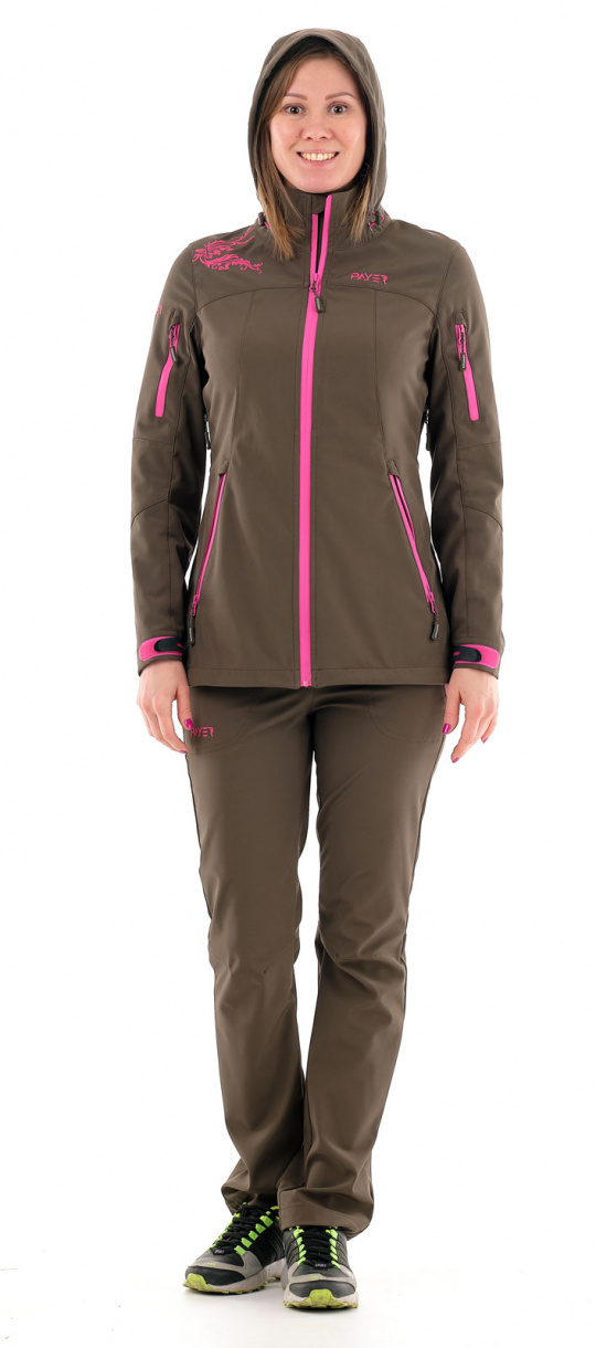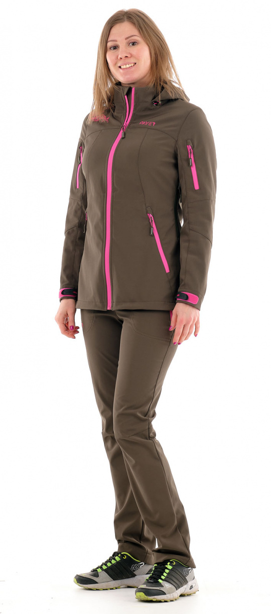 Женский костюм с высокими водоотталкивающими свойствами для активного отдыха и туризма. Состоит из куртки и брюк с анатомическим кроем. Спина куртки удлиненная, широкий пояс у брюк.