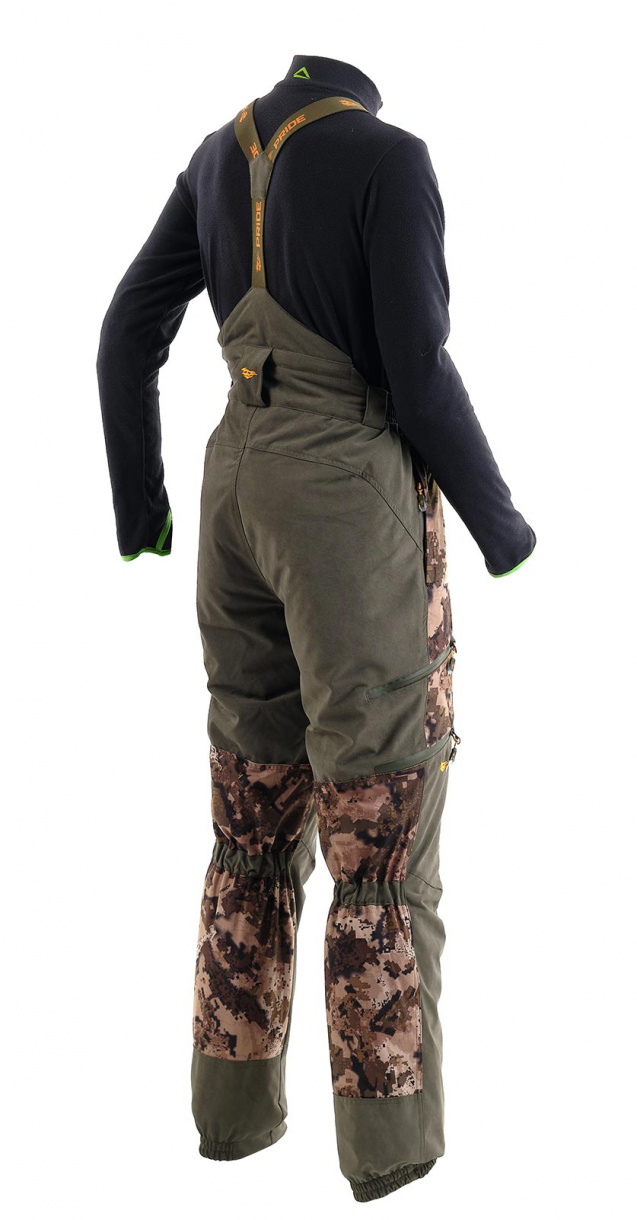 Костюм состоит из куртки и брюк. Куртка прямого кроя регулируется утяжками. Воротник-стойка переходит в утепленный капюшон, регулируемый по овалу лица и объему головы. Удобные наклонные карманы расположены на теле куртки и по бокам на брюках, все на молнии. Спинка брюк съемная, бретели регулируются.