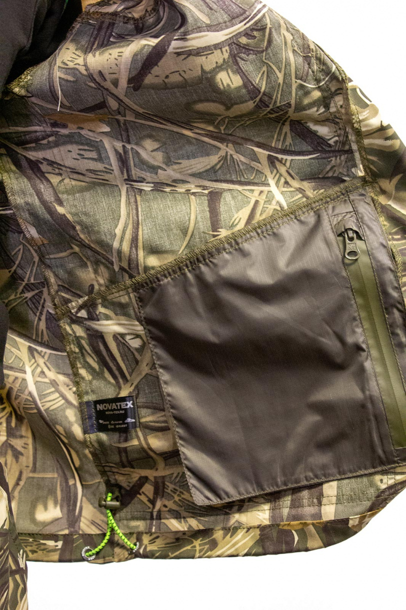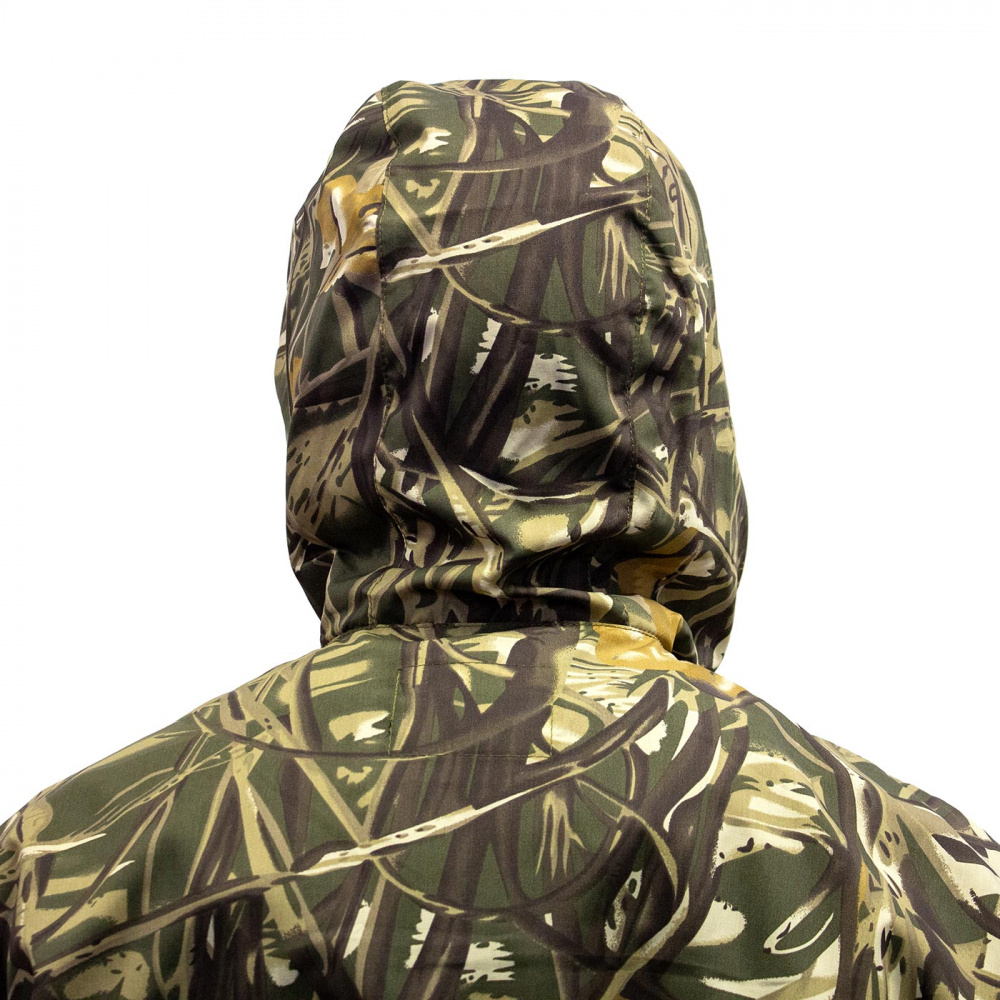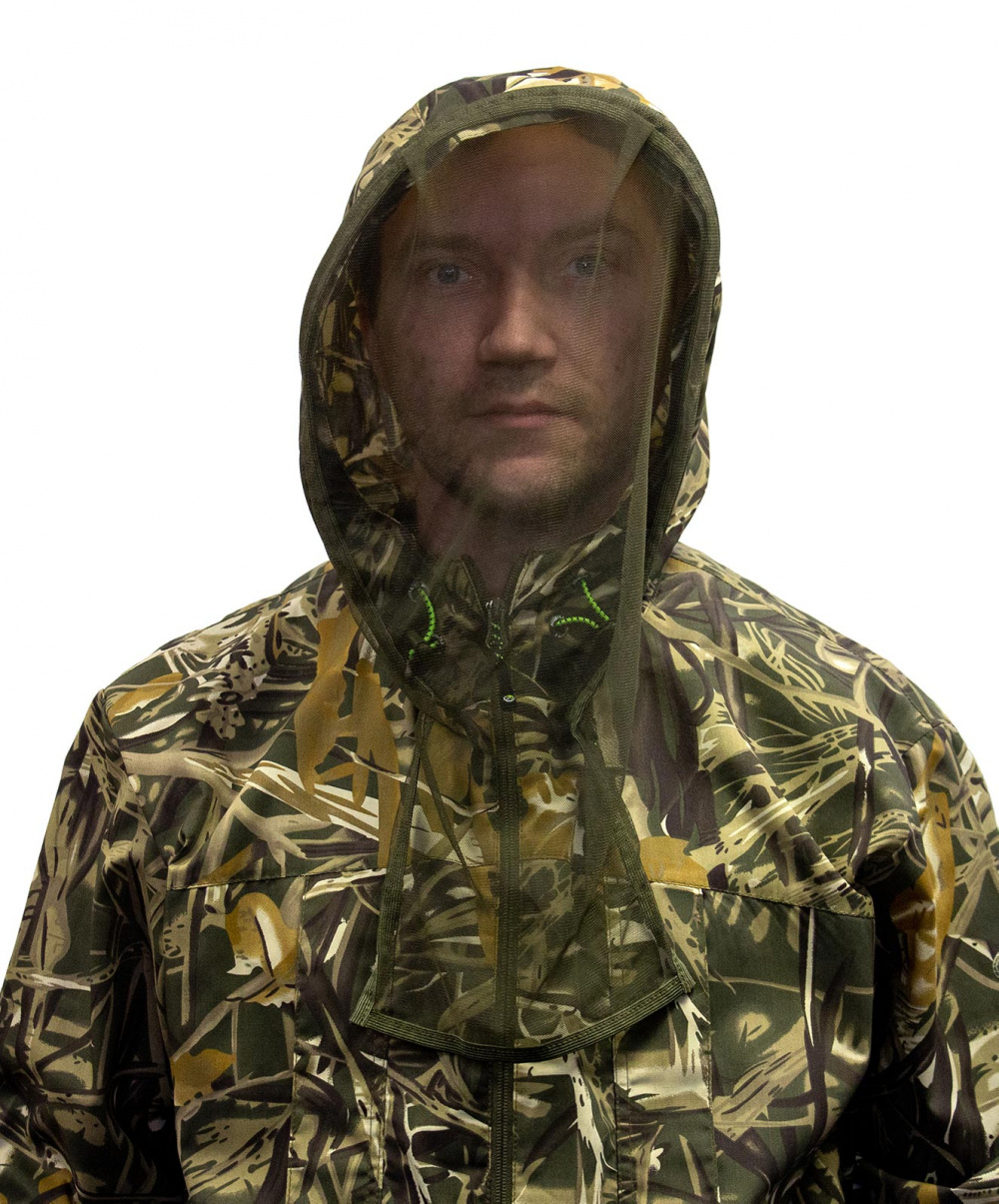 Удлиненная куртка по низу регулируется утяжками. Рукава куртки с манжетами плотно облегают руки, препятствуя проникновению насекомых. Капюшон регулируется по овалу лица шнуром. Антимоскитная сетка пристегивается к капюшону молнией и легко убирается в небольшой кармашек на груди. Широкие листочки четырех вместительных карманов защитят от попадания лесного сора.