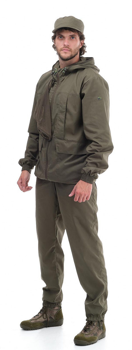 Удлиненная куртка по низу регулируется утяжками. Рукава куртки с манжетами плотно облегают руки, препятствуя проникновению насекомых. Капюшон регулируется по овалу лица шнуром. Антимоскитная сетка пристегивается к капюшону молнией и легко убирается в небольшой кармашек на груди. Широкие листочки четырех вместительных карманов защитят от попадания лесного сора.