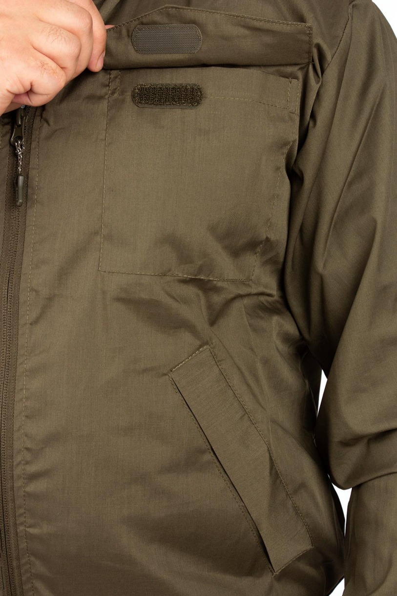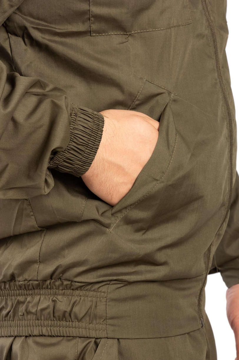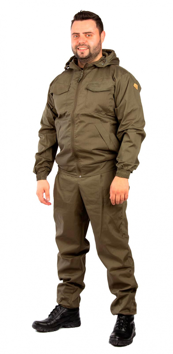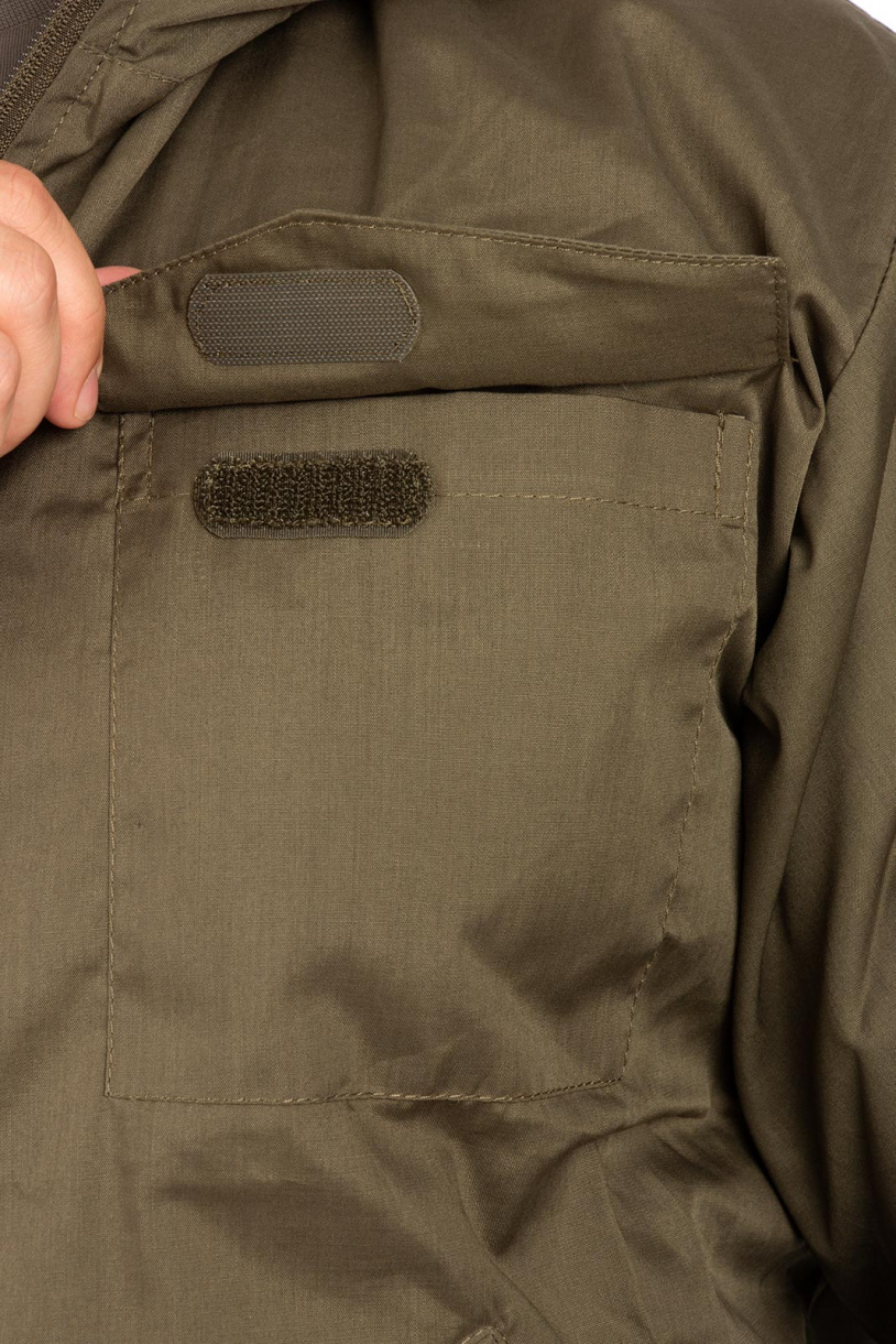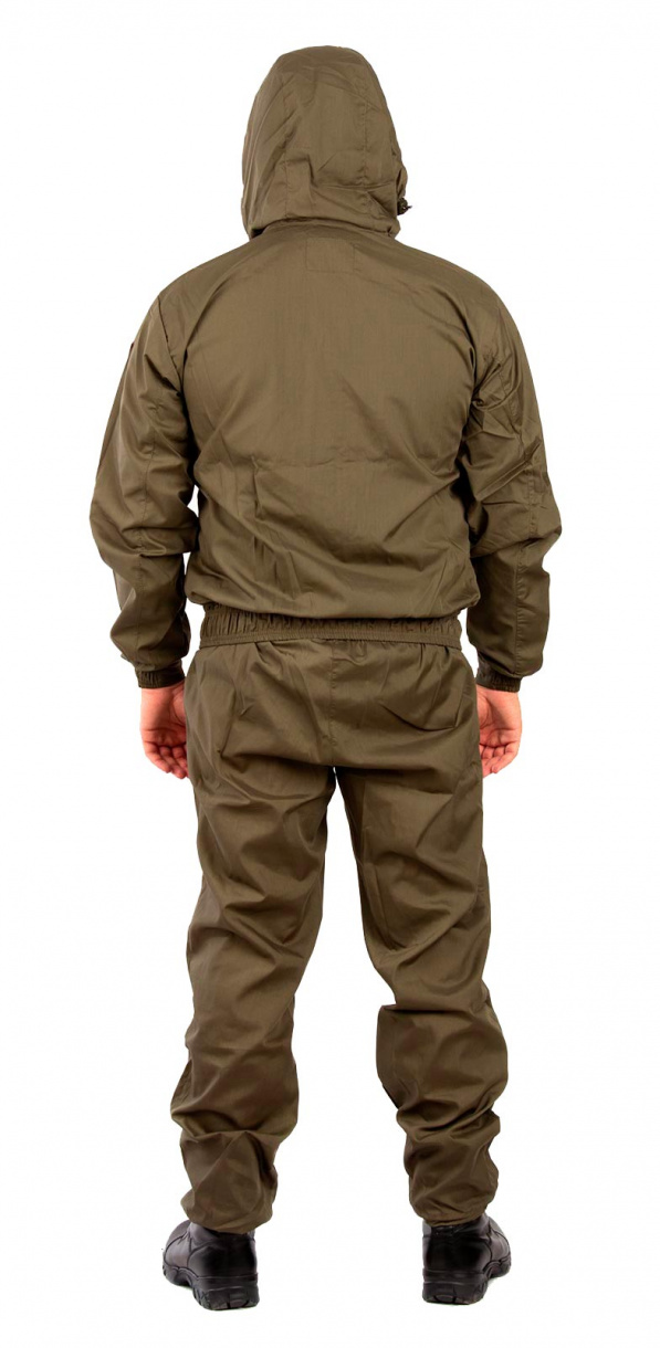 Низ укороченной куртки собран на широкую простроченную резинку. Капюшон регулируется по овалу лица. Два нагрудных кармана закрываются на клапаны с липучками, два нижних кармана с двойными листочками без застежки. Низ брюк и рукавов на резинке.