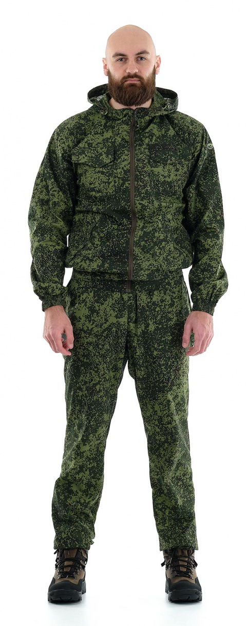Низ укороченной куртки собран на широкую простроченную резинку. Капюшон регулируется по овалу лица. Два нагрудных кармана закрываются на клапаны с липучками, два нижних кармана с двойными листочками без застежки. Низ брюк и рукавов на резинке.