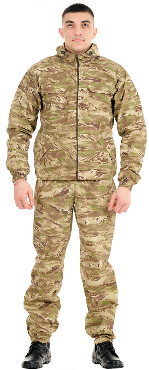 Низ укороченной куртки собран на широкую простроченную резинку. Капюшон регулируется по овалу лица. Два нагрудных кармана закрываются на клапаны с липучками, два нижних кармана с двойными листочками без застежки. Низ брюк и рукавов на резинке.