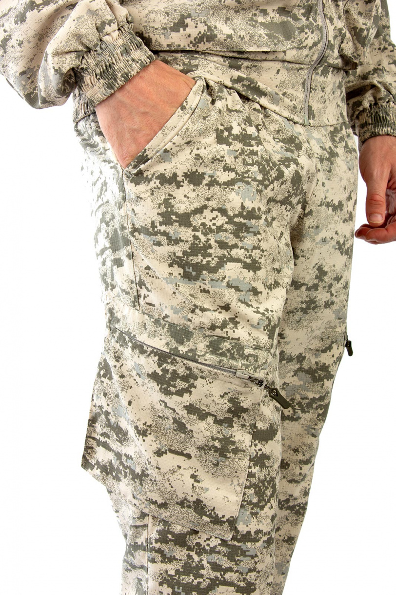 Пояс брюк полностью эластичный, дополнен шлевками. Низ брюк собран на резинку. Два вместительных объемных набедренных кармана на молниях и два кармана у пояса без застежки.