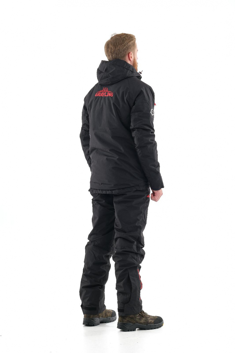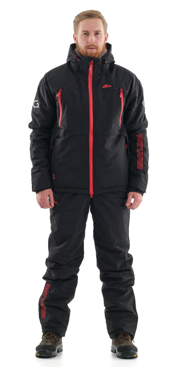 Костюм состоит из куртки и брюк. Куртка прямого кроя удлинена в районе спины. Низ куртки регулируется утяжками. Капюшон с козырьком отстегивается и также регулируется. На рукавах расположены липучки по внешней части и манжеты из неопрена (защита от ветра) внутри. Наружные карманы утеплены мехом вельбоа. У брюк отстегивается спинка, пояс регулируется вшитой резинкой и липучками. По низу брюк вшиты молнии и липучки также для регуляции объема. Карманы по костюму вместительные, есть внутренний для документов.