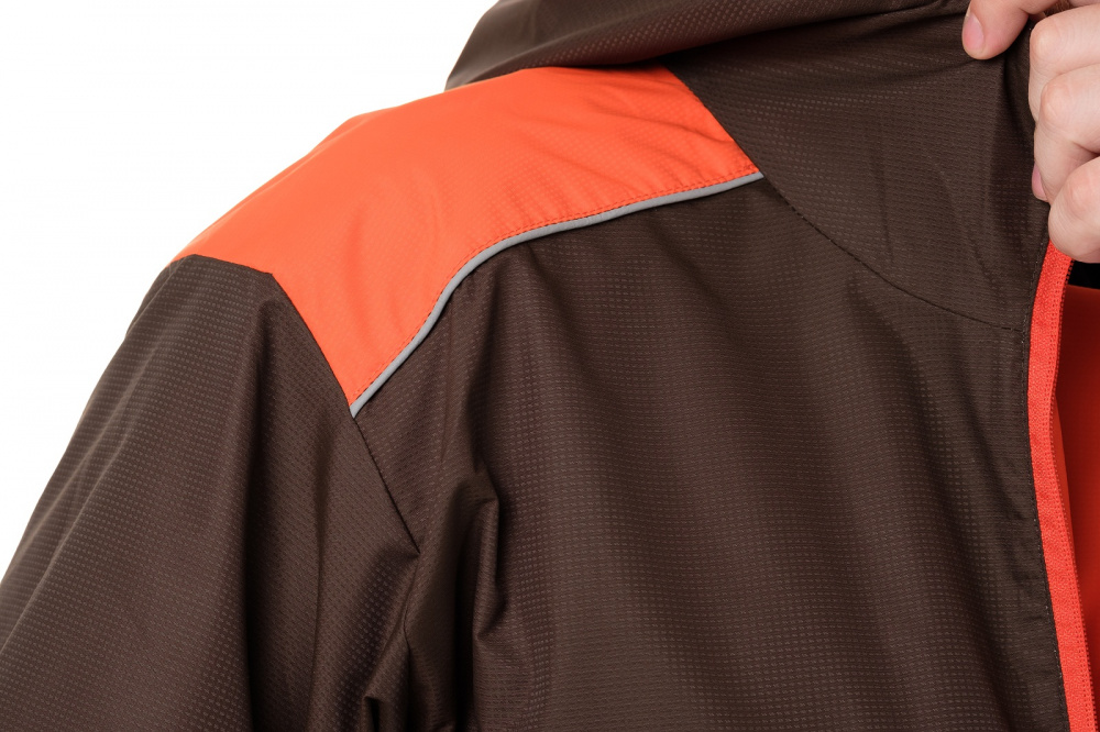 Рукава куртки и низ брюк собраны на резинку. Капюшон регулируется по ширине шнуром со стопорами. Низ куртки утягивается. Плечи усилены дополнительным слоем мембранной ткани - можно смело надевать рюкзак. Светоотражающий кант на рукавах и плечах сделает вас заметными в темное время суток на дороге. Яркие вставки позволят не потеряться в лесу.