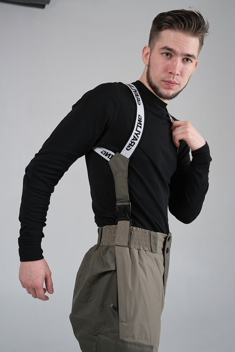 Брюки можно отрегулировать по росту при помощи специальных лямок системы «кобура» - лямки крепятся по бокам, перекрещиваются на спине, не спадают при движении, не натирают шею. При желании можно отстегнуть. Подклад флисовый, ниже колена скользящий. Снегозащитная юбка.