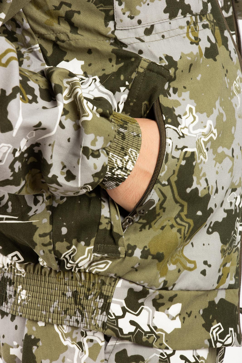Низ укороченной куртки и рукавов собраны на широкую простроченную резинку. Капюшон регулируется по овалу лица. Два нагрудных кармана закрываются на клапаны с липучками, два нижних кармана с листочками без застежки.